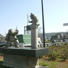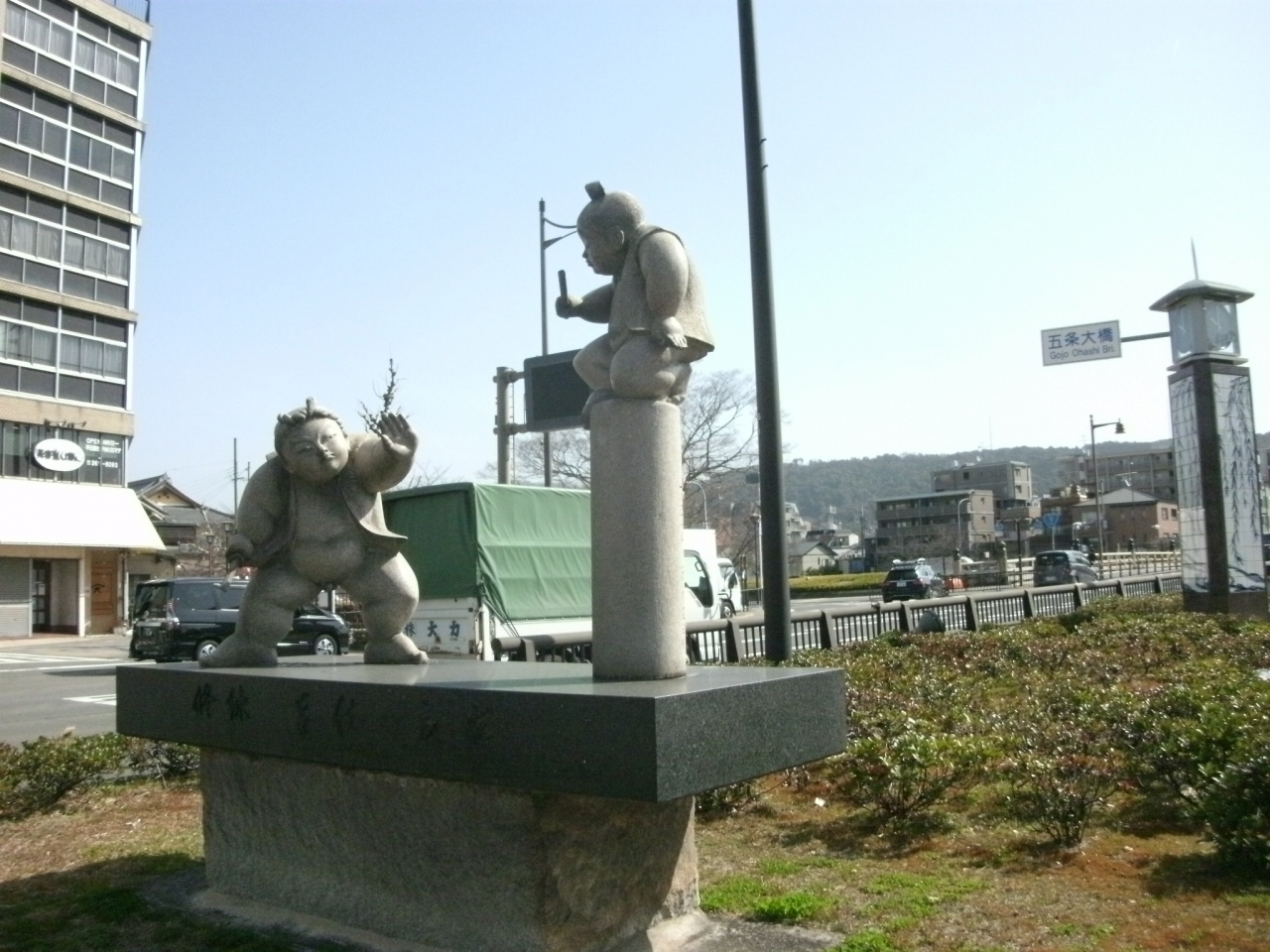 河原町五条の交差点の東側の信号を渡る途中、五条大橋の西詰めのグリーンベルト内にあります。牛若丸と弁慶の決闘を表した像だそうですが、まるっこい可愛らしい石像で可愛らしすぎて、牛若丸や弁慶のイメージとは少し違うように感じました。