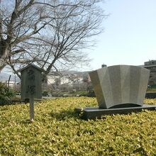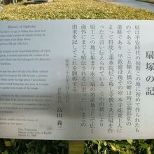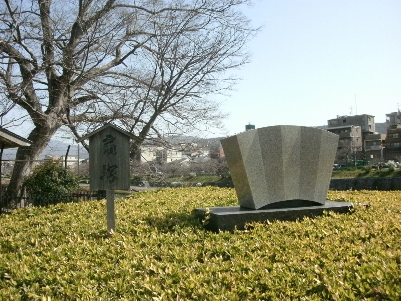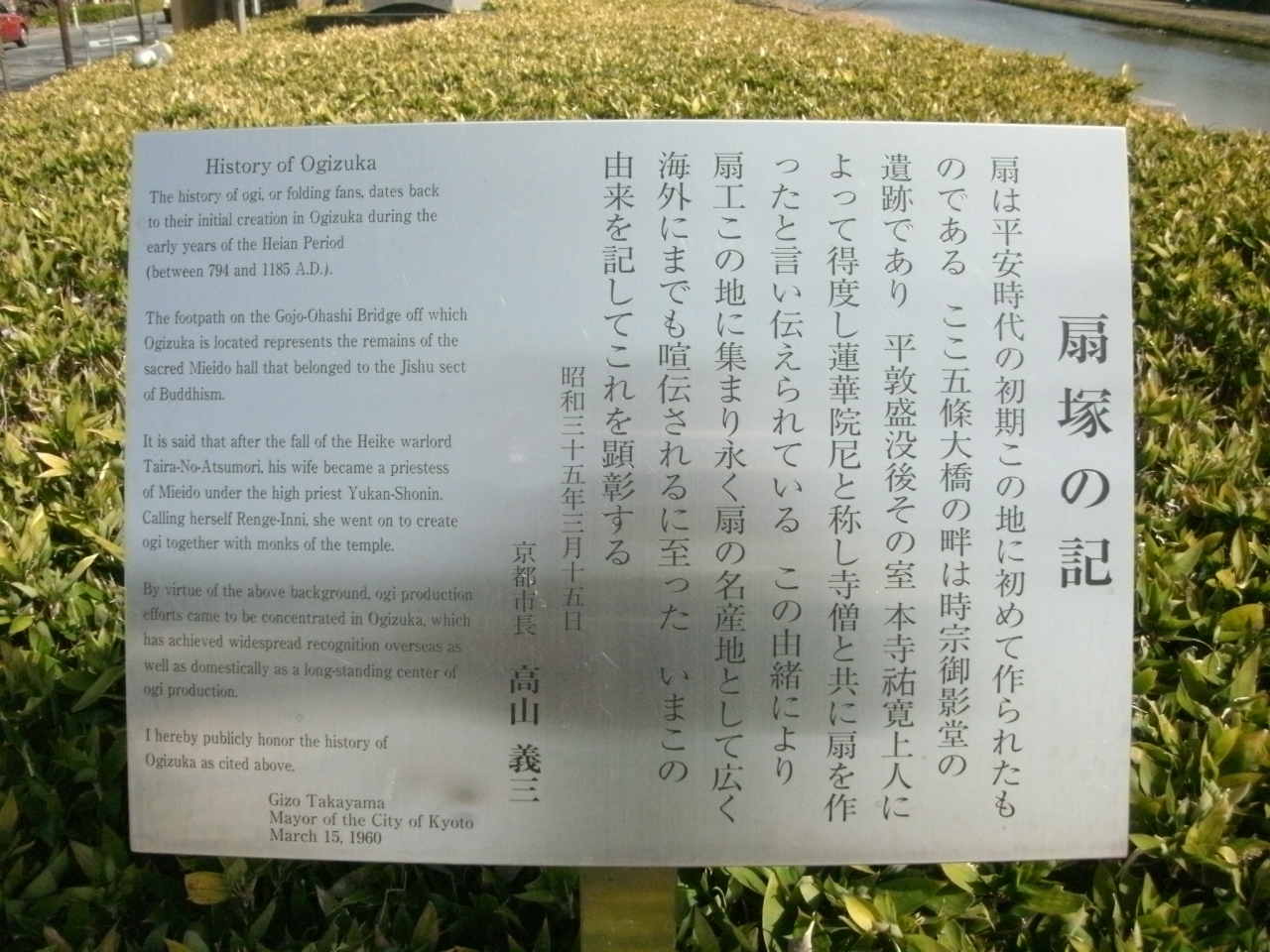 五条大橋の西北詰、植え込みの中に立っています。現地にある説明板(添付写真参照ください)によると、この辺りに時宗御影堂があり、平敦盛没後、彼の妻が御影堂の寺僧とともに扇作りをはじめ、それ以来この界隈に扇工が集まることになったことに由来するもので、1960年(昭和35年)に御影石で作った扇形の碑が建立されたとか。塚自体は地味なもので、説明板がないと見逃してしまいそうなものです。