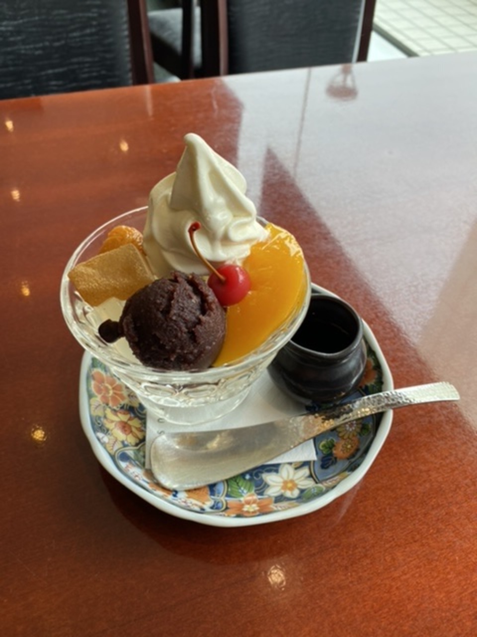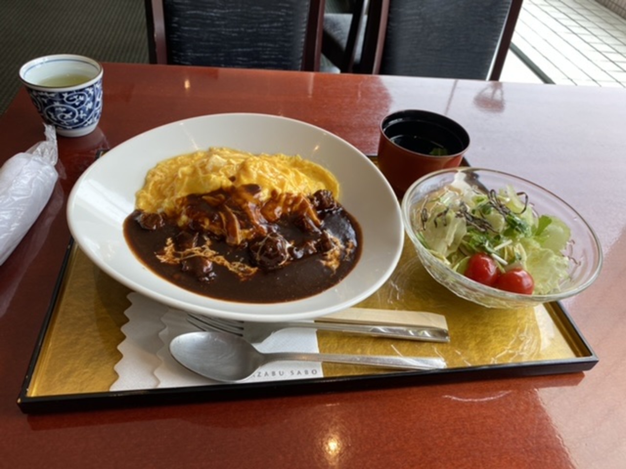 食べたのはオムハヤシライスにミニクリームあんみつ!オムハヤシライスにはゴロゴロ牛肉が入っています。
