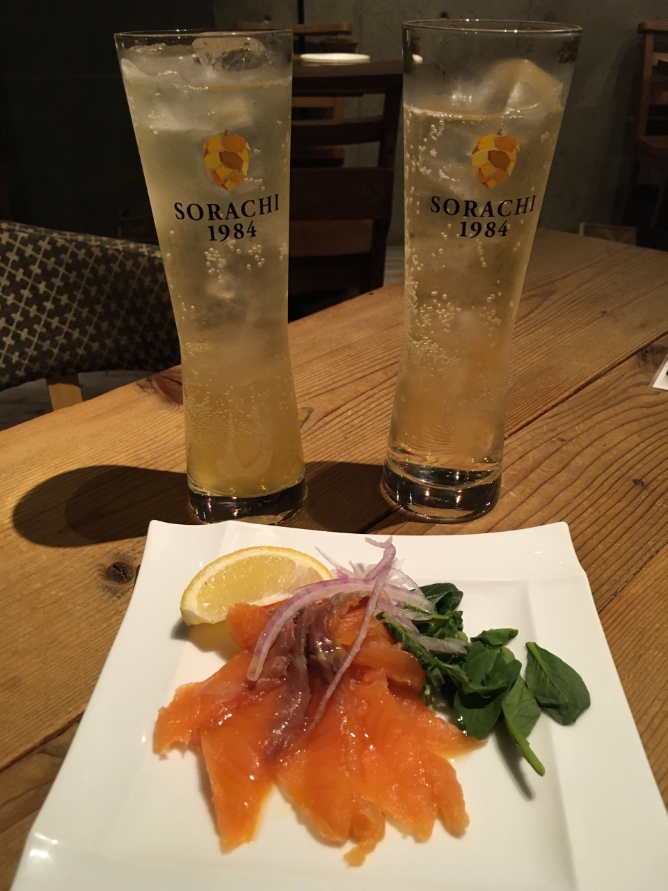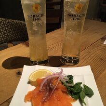 ハービスプラザの地下、飲食店があるフロアにあります。本店は南船場にあり、北梅田店として中津にもお店があるようです。店内はすっきりとした内装で控えめな照明と、落ち着いた雰囲気です。週末だったので店内はお客さんで賑わっていました。アルコールは柚子ハイボールをまずいただきました。お料理はアルコールと一緒に楽しむタパスメニューを中心に、ピザ、パスタ、お肉や野菜のグリルやサラダもあり種類豊富に揃っていて、季節限定メニューもありました。タパスメニューからスモークサーモンやマッシュルームなど、他リゾットやグリル野菜、サーロインステーキを注文しました。ステーキが柔らかくて美味しかったです。梅田にありながらリーズナブルな価格でした。