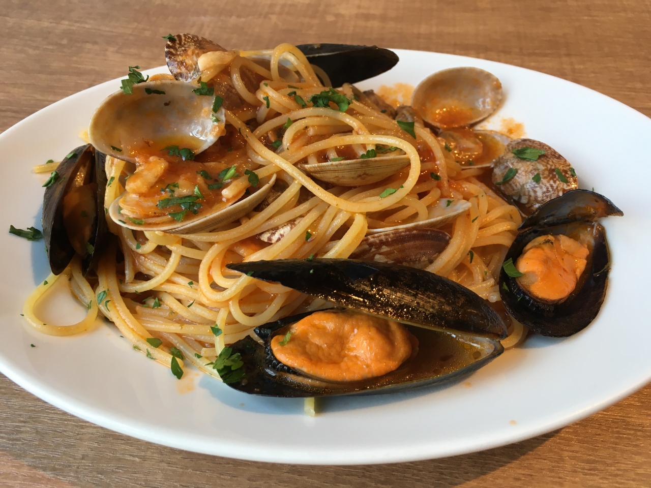 JRや京阪京橋駅から徒歩数分のところにあるリバーカントリーガーデン京橋1Fにあるイタリアンレストランです。京橋の中心地と思えない緑に囲まれた煉瓦造りのオシャレな外観です。ランチで利用しました。天井も高く広々とした店内ではプロジェクターで、オードリーヘップバーンの映画、ローマの休日が映し出されていました。ランチはパスタとピザ、ハンバーグメニューから選択できますが、開店と同時に入ったにも関わらずハンバーグは品切れと言われました。ペスカトーレとマルゲリータを注文し、2人でシェアしていただきました。パスタは貝が沢山入っていて美味しかったですが、ピザは小さく食べ応えがありませんでした。選択できるメニューが少ないうえ、サラダやドリンクなどセットメニューもないので、ランチよりカフェで利用したら良かったかなと思いました。