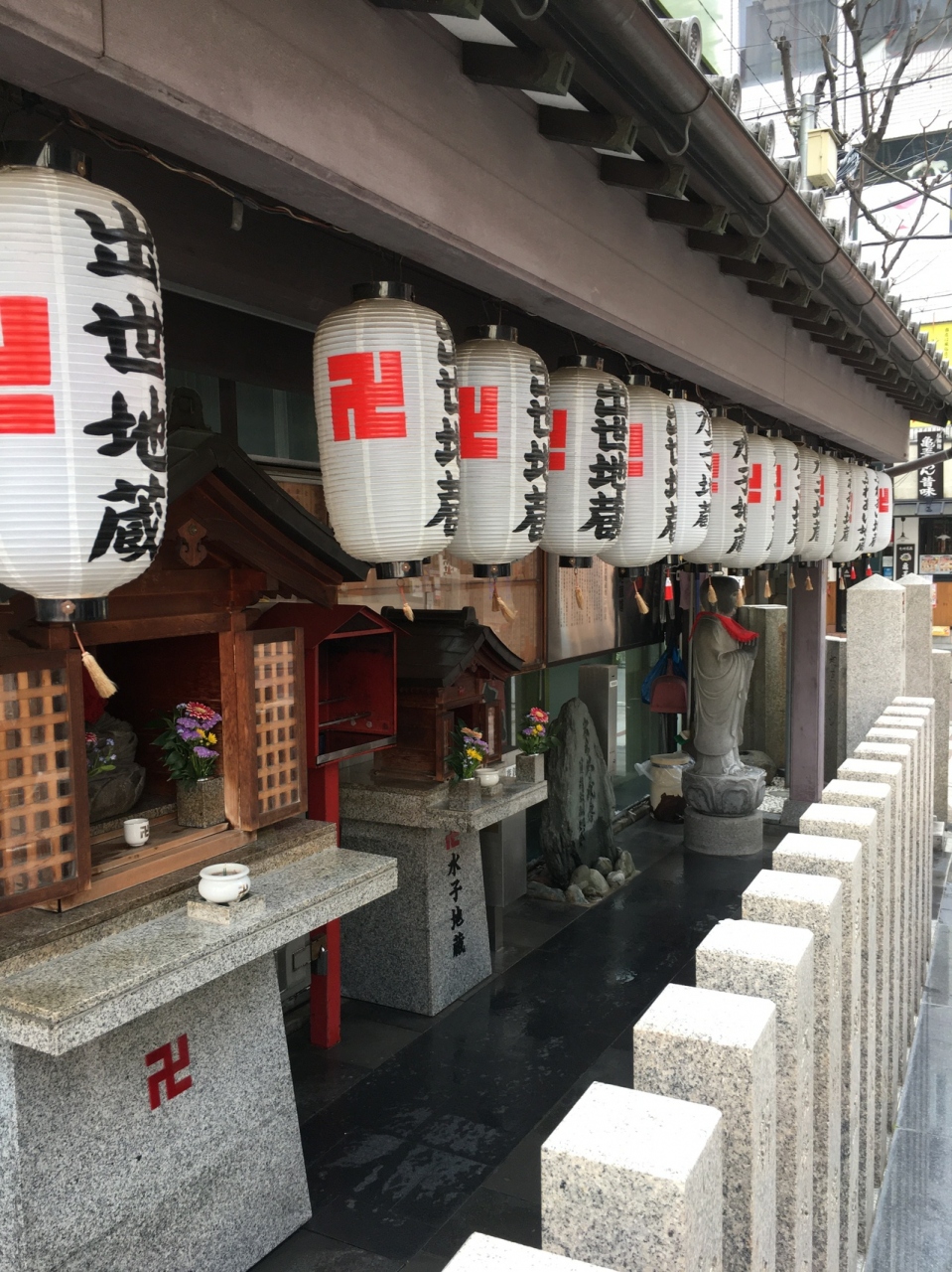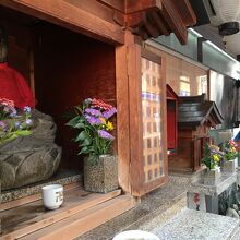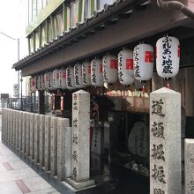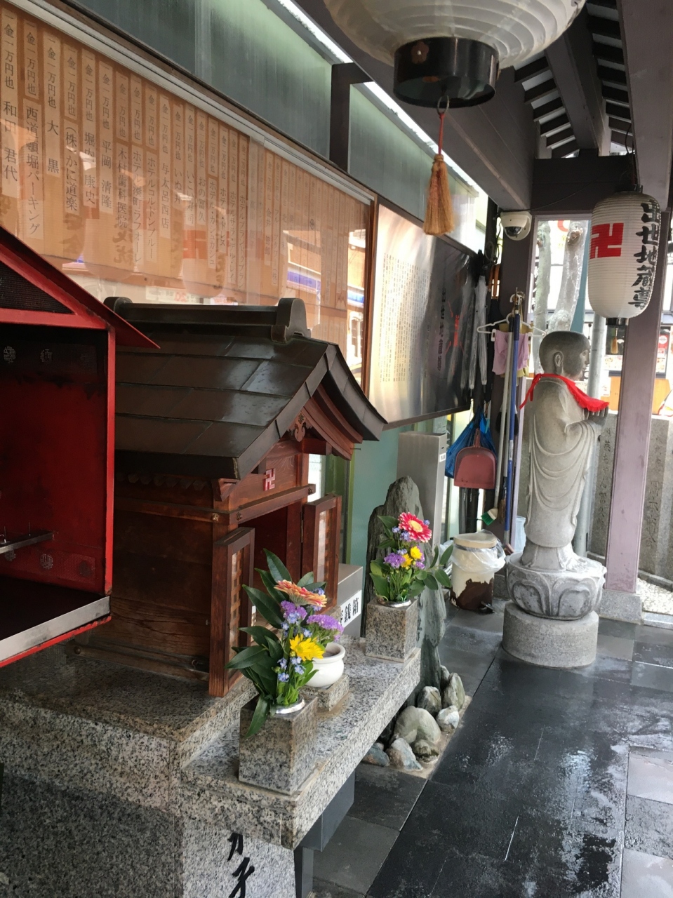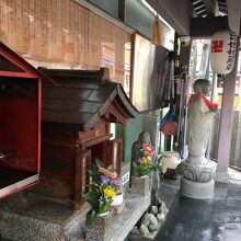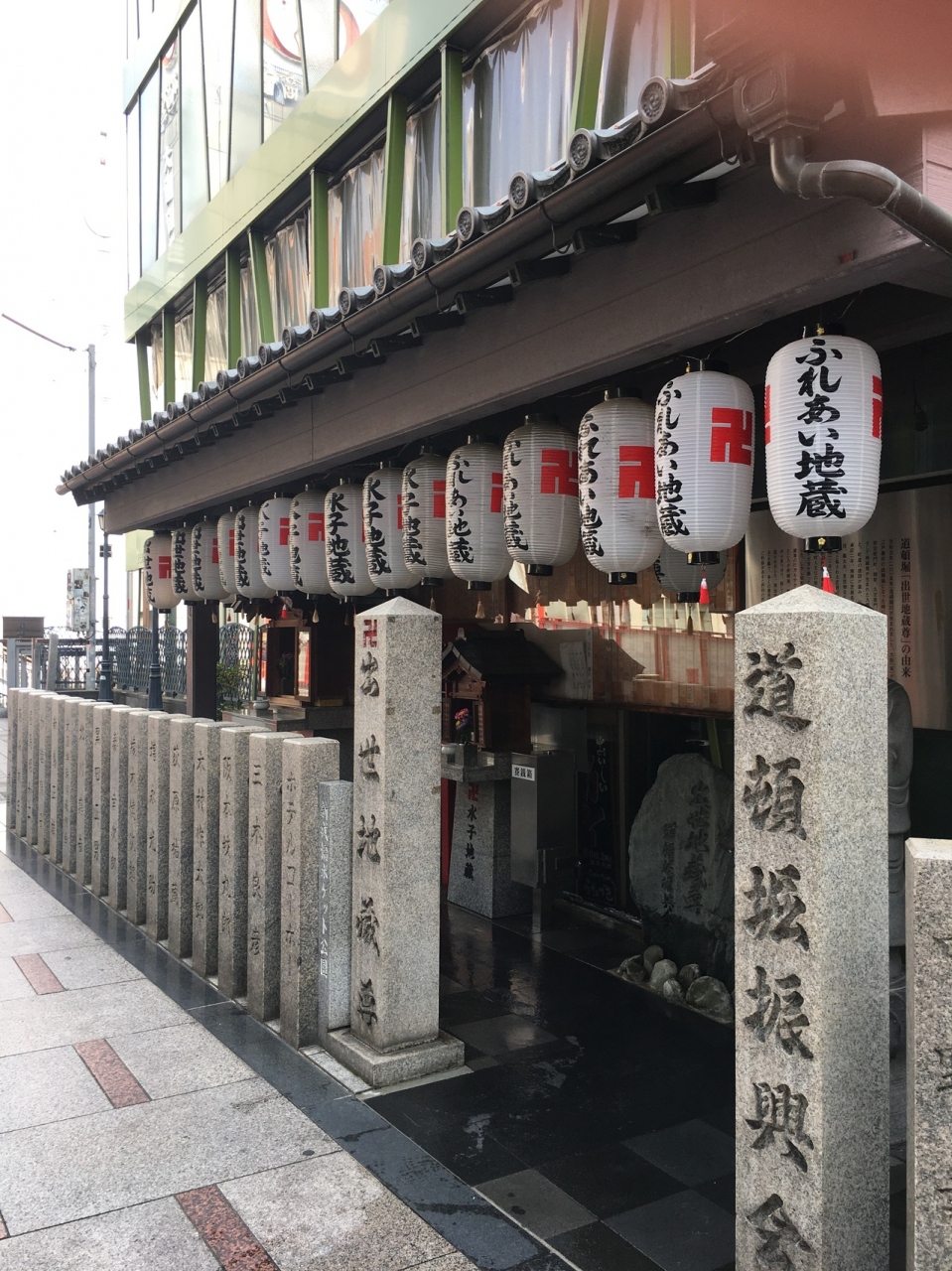 新戎橋の手前にありました。ビルの下にあり手前には石の杭のようなものが数本建っていて出入口は二つです。赤い前掛けした立っているお地蔵があり、小さな祠の中には鎮座しているお地蔵もあります。石碑もあり混み合ってはいないですが参拝客が絶えない場所でした。