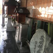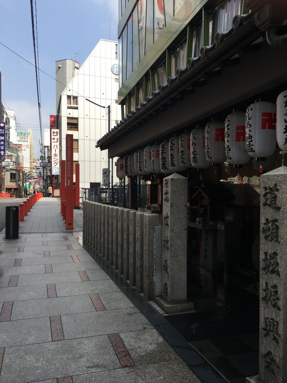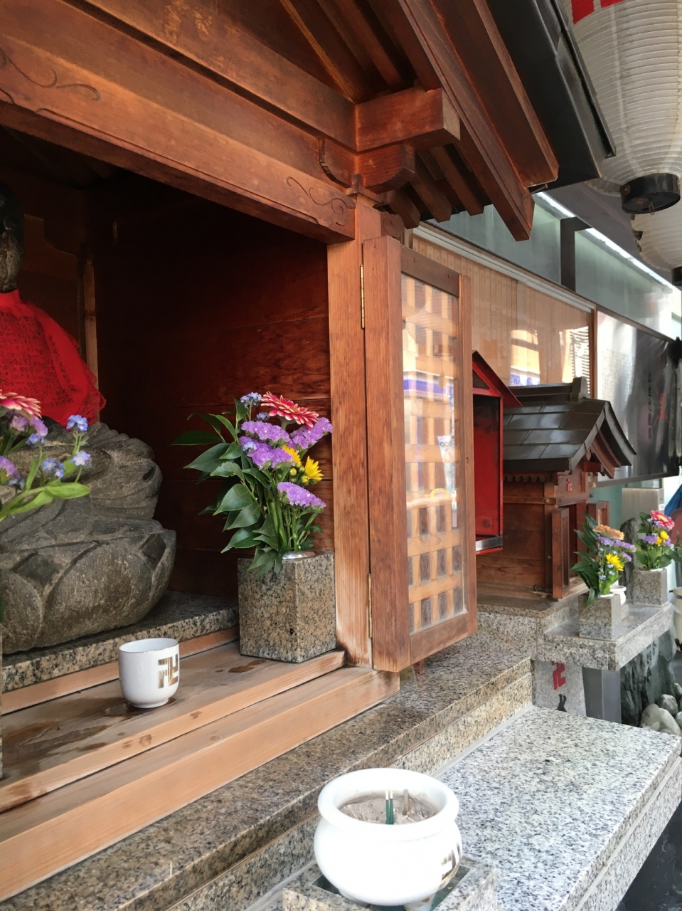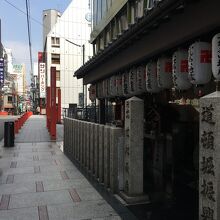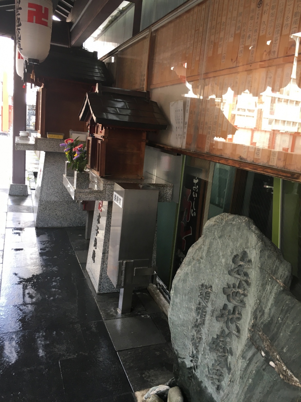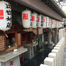 新戎橋の手前にありました。ビルの下にあり手前には石の杭のようなものが数本建っていて出入口は二つです。赤い前掛けした立っているお地蔵があり、小さな祠の中には鎮座しているお地蔵もあります。石碑もあり混み合ってはいないですが参拝客が絶えない場所でした。