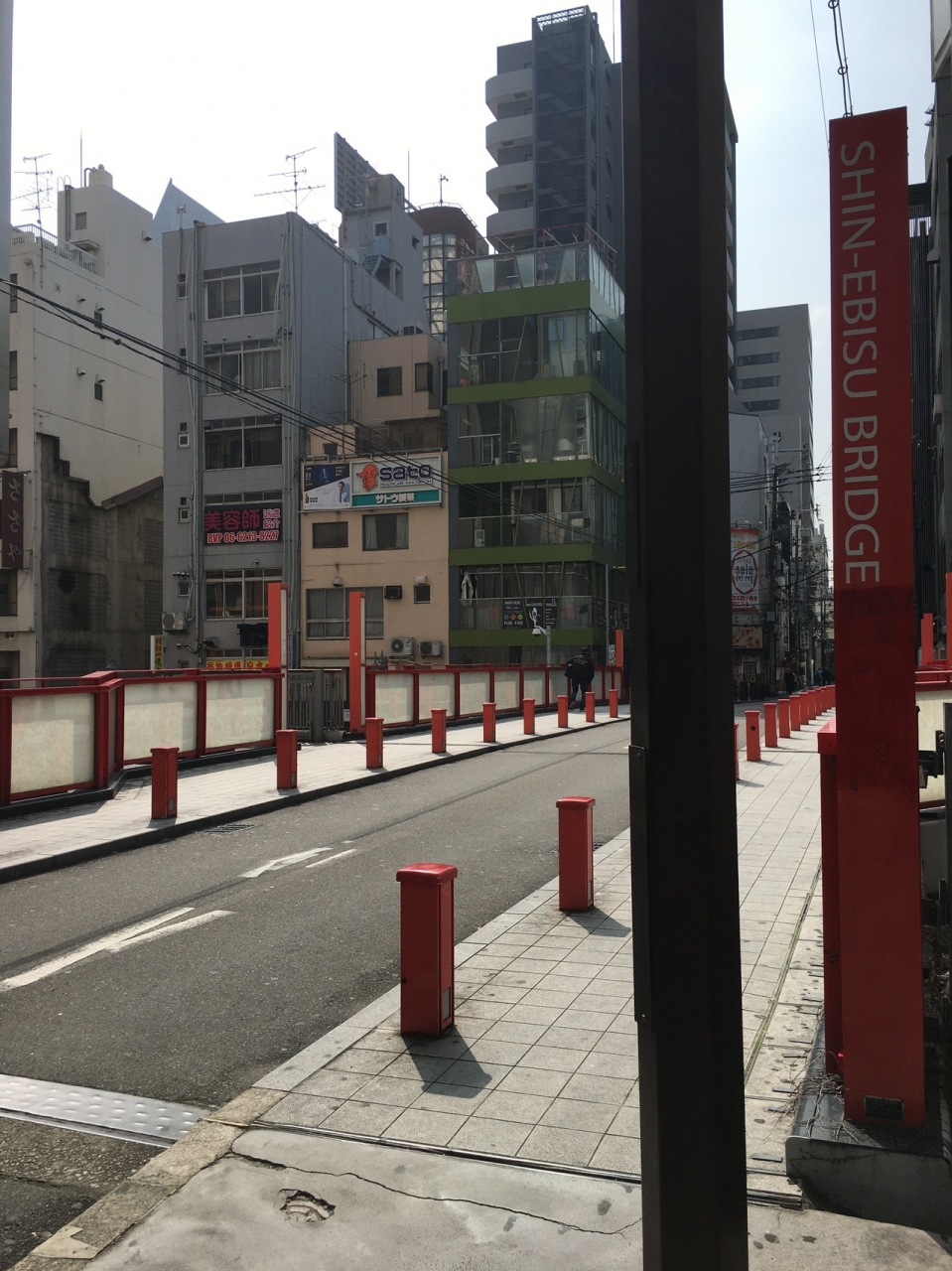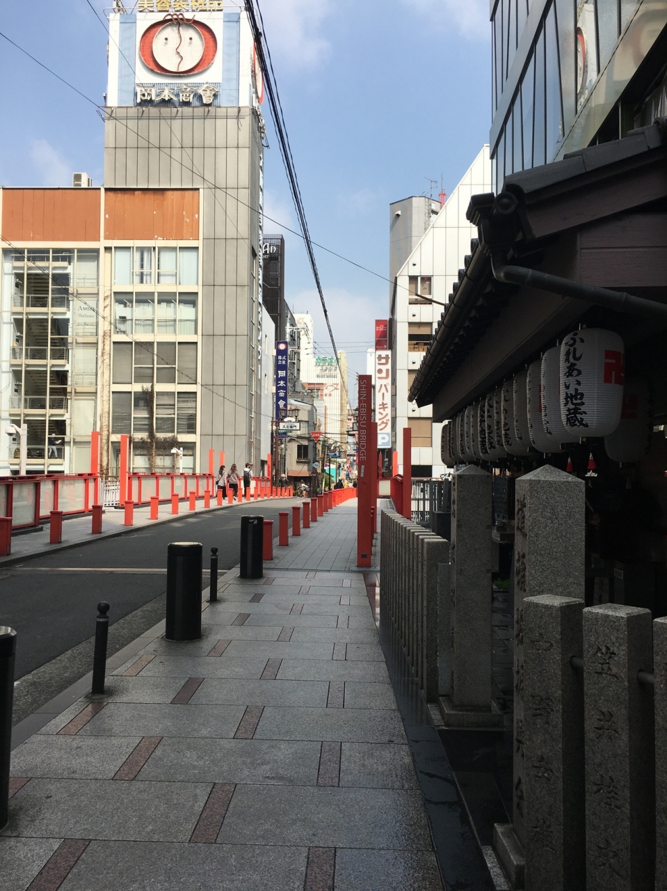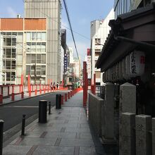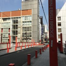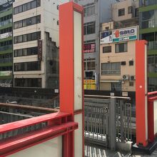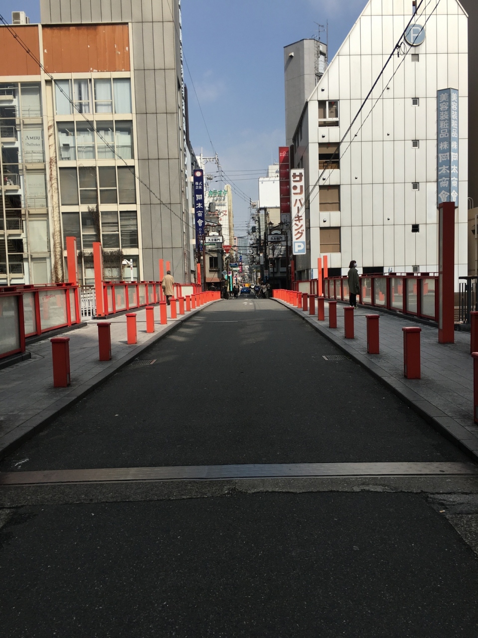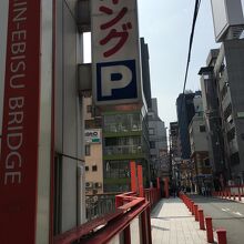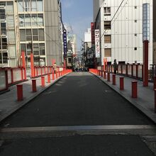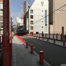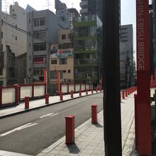 橋を渡る手前には出世地蔵尊がある赤い橋で、川の下の道頓堀川幅が短いため、橋の長さも短く、中央は車が1台のみ通れる道と左右は歩道で車道との間には赤い棒のようなものが間隔を置いて建っていました。橋の両サイドは商店街です。