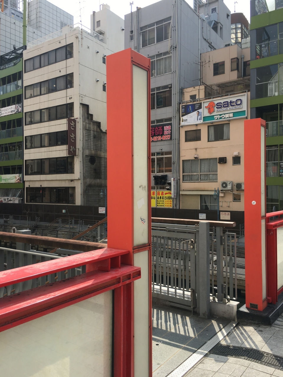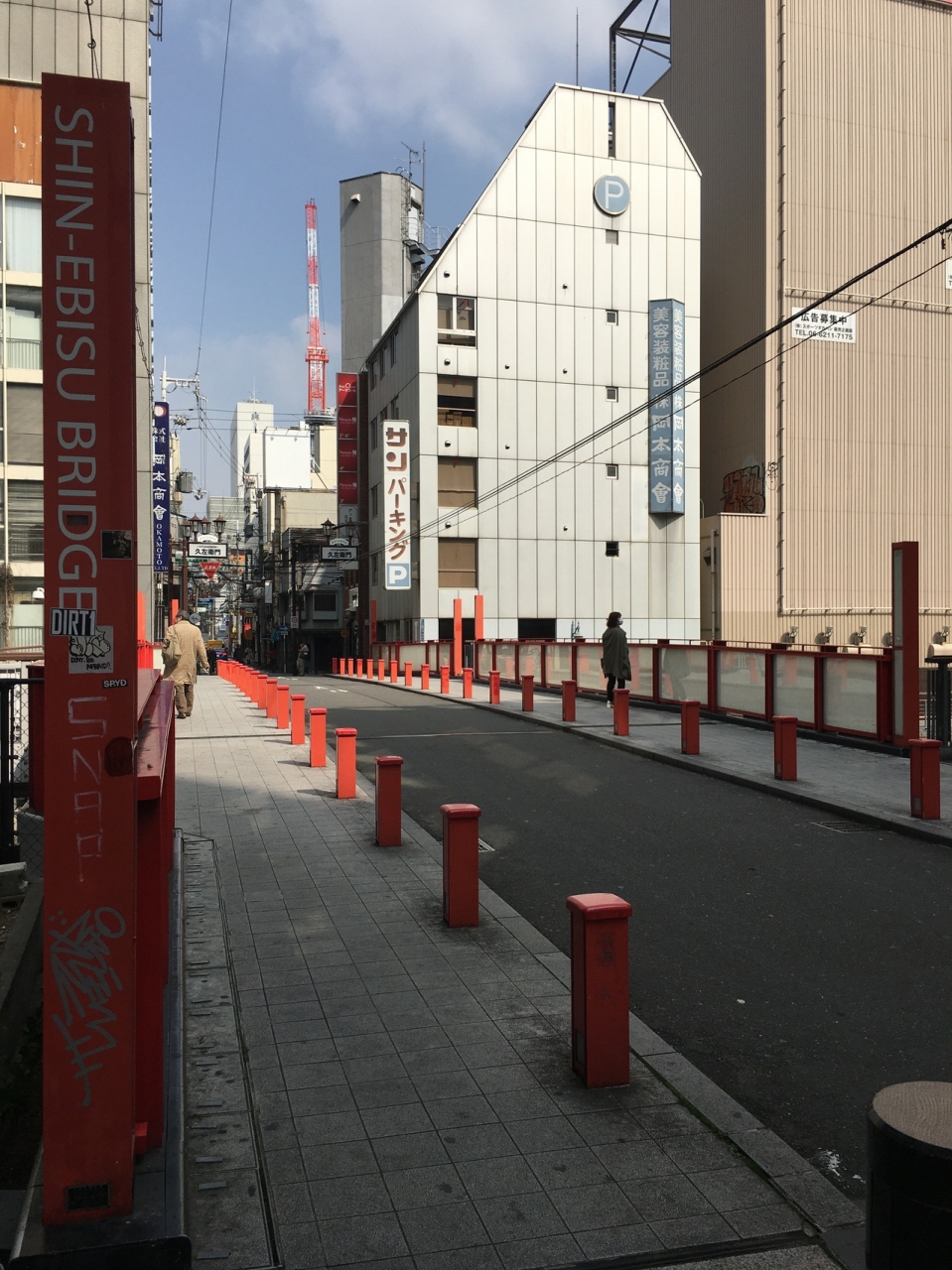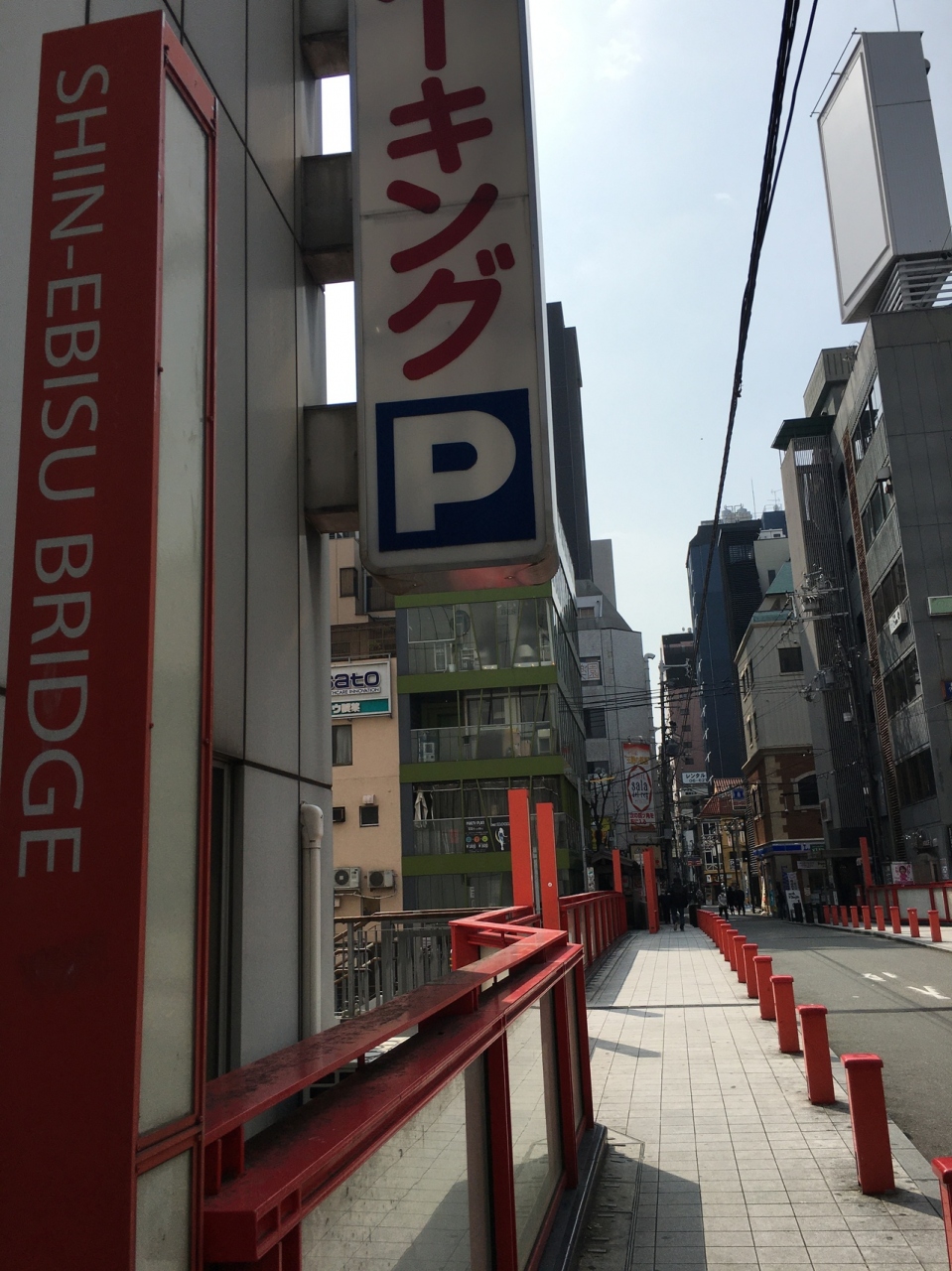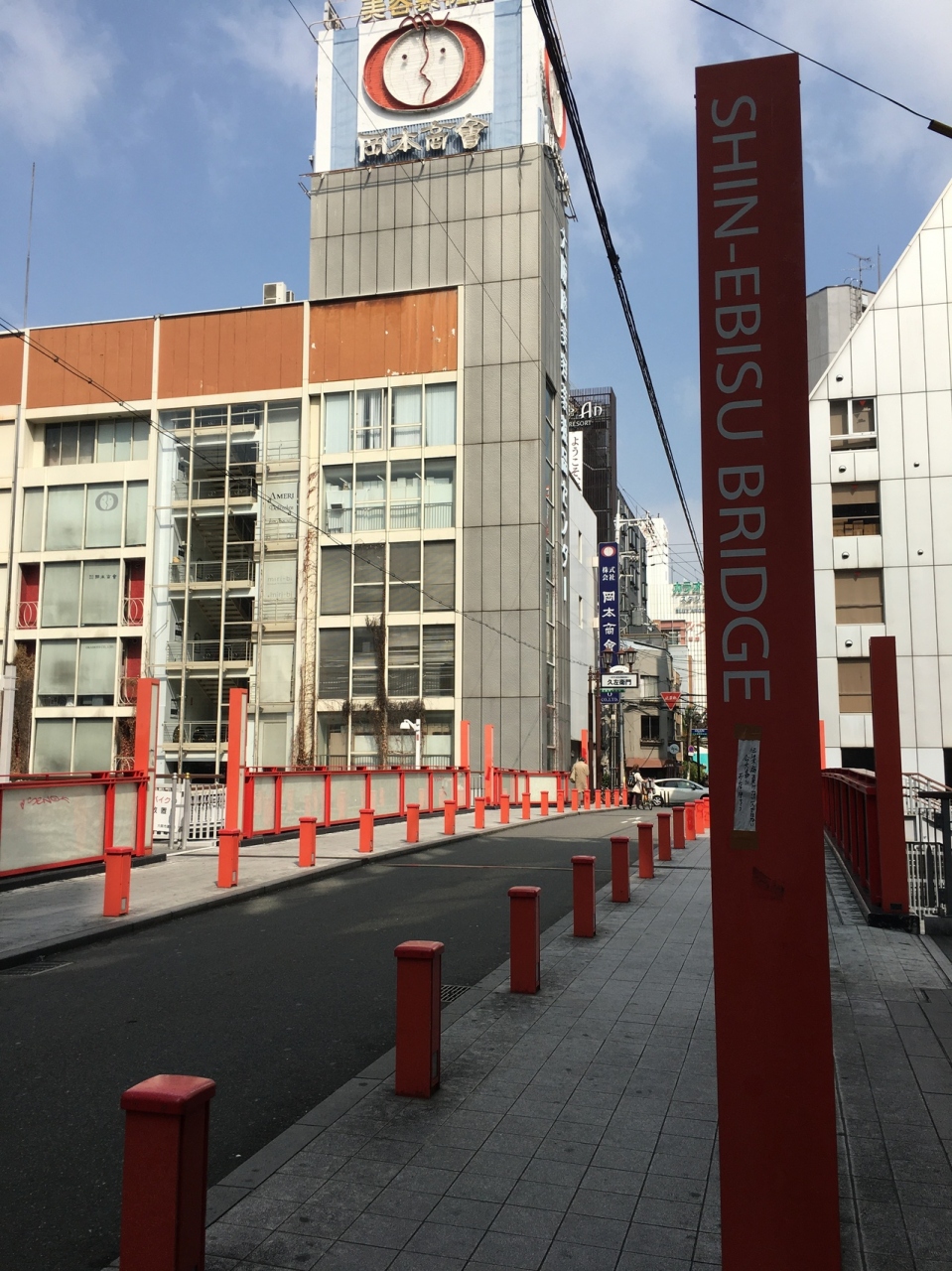 橋を渡る手前には出世地蔵尊がある赤い橋で、川の下の道頓堀川幅が短いため、橋の長さも短く、中央は車が1台のみ通れる道と左右は歩道で車道との間には赤い棒のようなものが間隔を置いて建っていました。橋の両サイドは商店街です。
