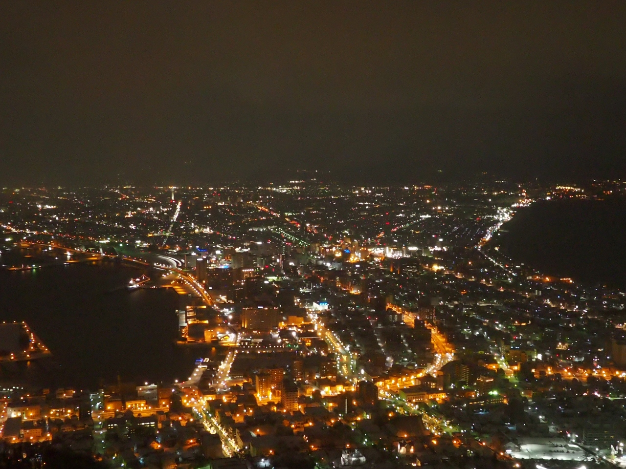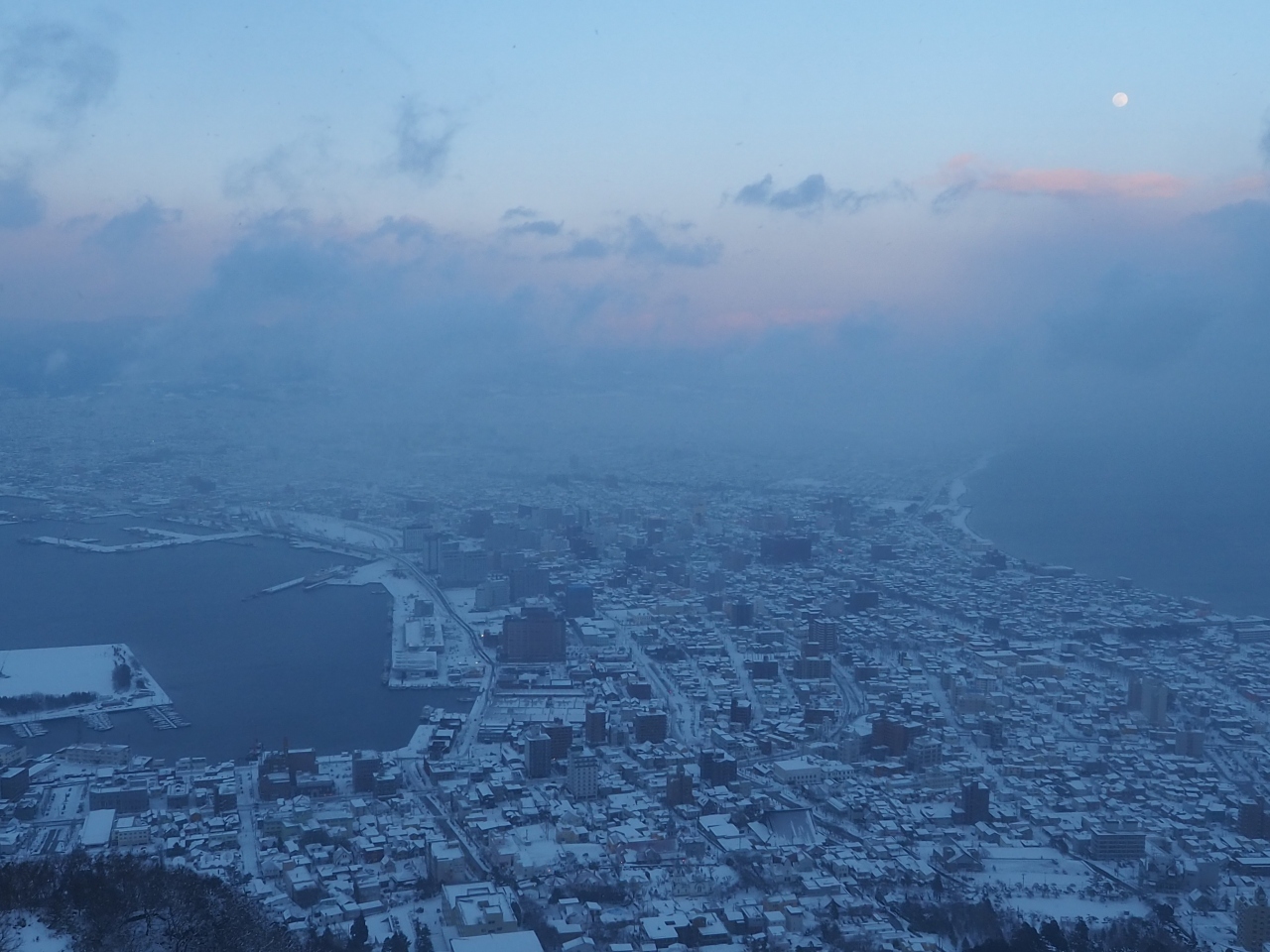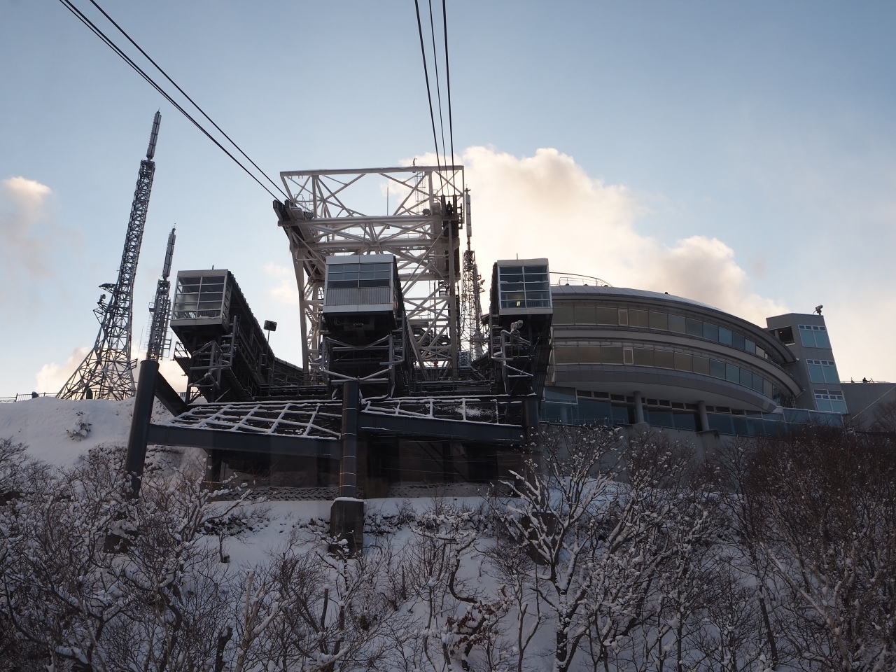 この日は短時間で天気がコロコロ変わり、山頂付近は吹雪いていて長時間屋外にいることはできませんでした。それでも、雪がやんで函館の夜景が見えたときには、来た甲斐があったと思いました。