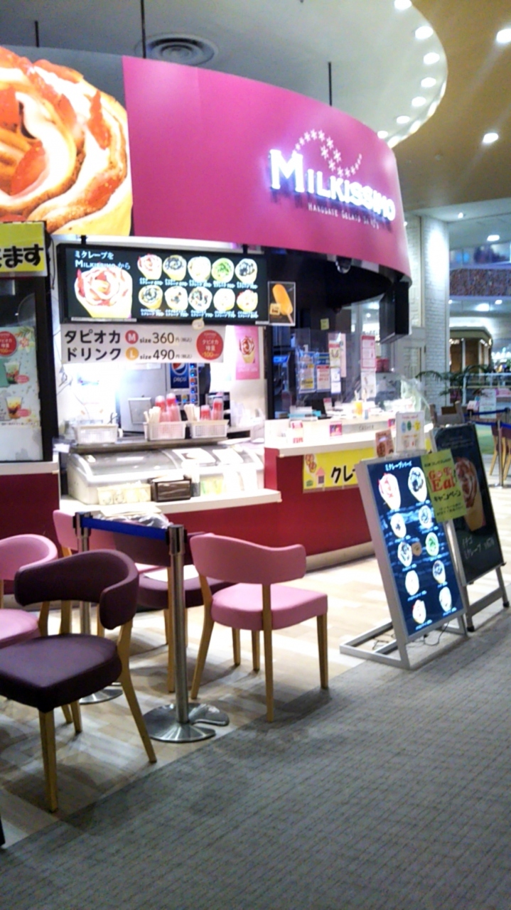 「越谷イオンレイクタウン・mori」の2Fにある『ミルキッシモ イオンレイクタウンmori店』は、クレープとタピオカドリンク、ジェラートがいただけるカフェです。