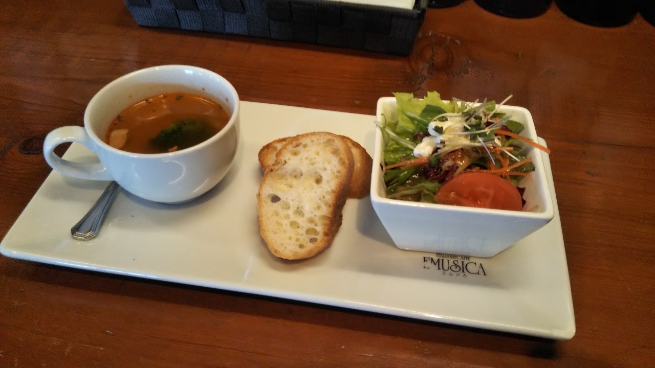 サラダとパンがあったので、ブルスケッタに自分でするのかな?とも一瞬思いましたが、サラダが大きくカットされたモノが多いので、ちょっと無理っぽくそのまま、いただきました。サラダはフレッシュ感があって良かったです。パンはもう少し焼きが入っているのと好みかなぁ~、 スープはミネストローネでしたが、お湯分が多い感じで微妙。