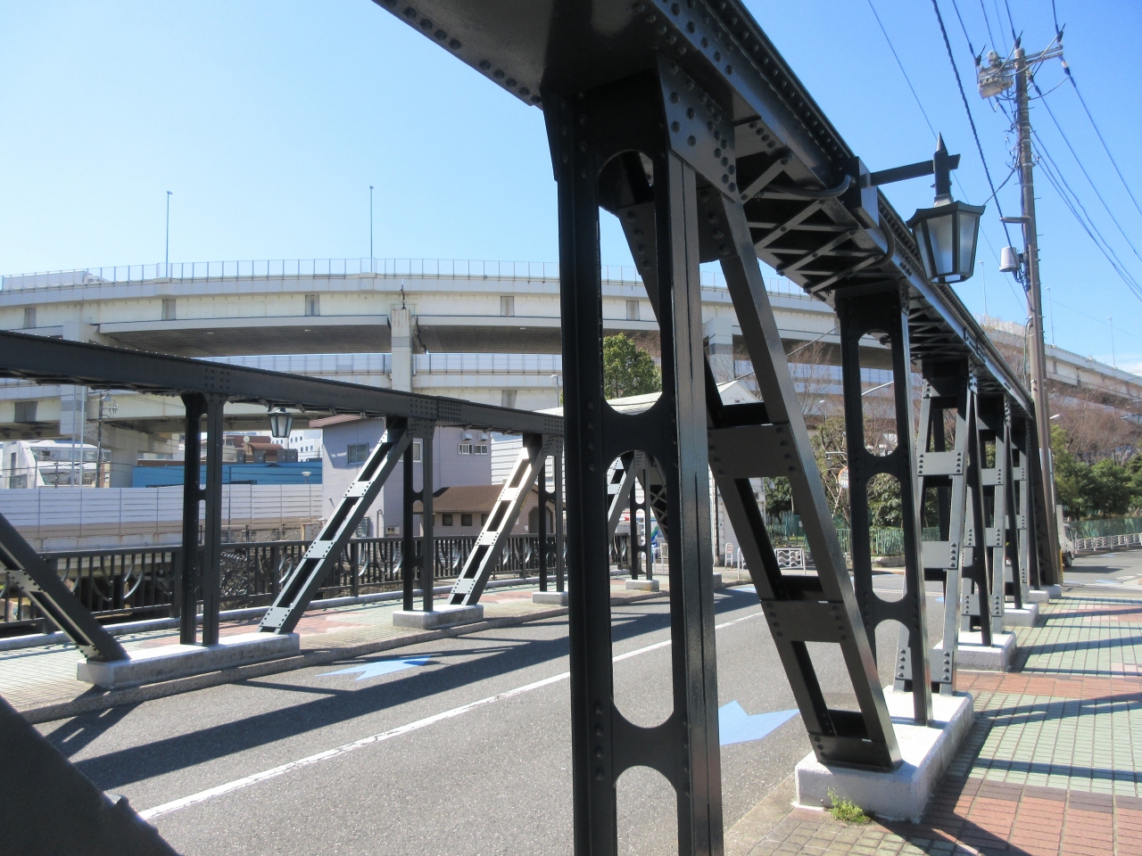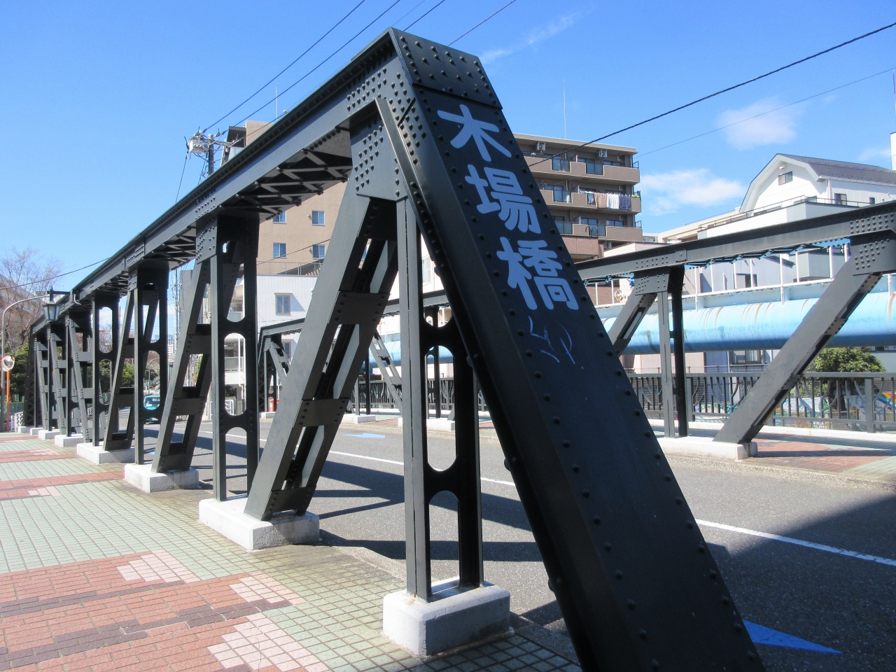 木場駅から三ツ目通りを北へ進み、木場三丁目交差点を左折すると木場橋が見えてきます。駅から7分ほど歩きます。大横川に流れる大島川東支川に架かる黒い橋です。長さ27mほどで、車道の両側に歩道があります。歩道側にレトロな街灯があります。今回の散策のスタートが赤い新田橋だったので、木場橋の黒い色が渋く見えました。