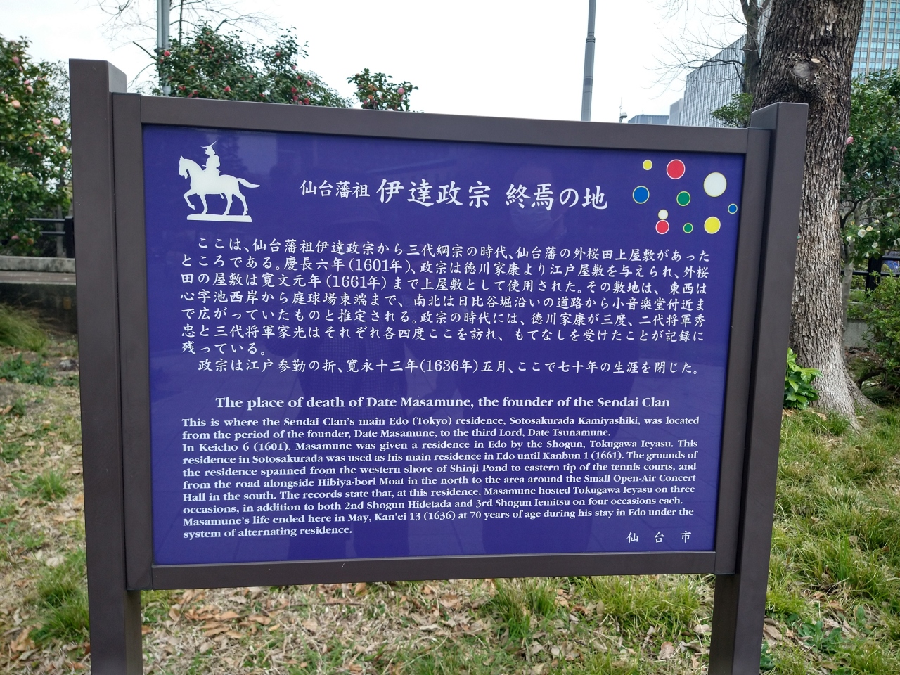 江戸時代に入った頃、徳川家康から仙台藩に与えられた屋敷がここ日比谷公園にあったそうです。広さとしてはだいたい日比谷公園の北側半分よりひとまわり小さいくらい。60年ほどは仙台藩の屋敷として使われていたそうです。江戸城の超お膝元なので、伊達氏が徳川家にいかに気に入られていたのかわかりますね