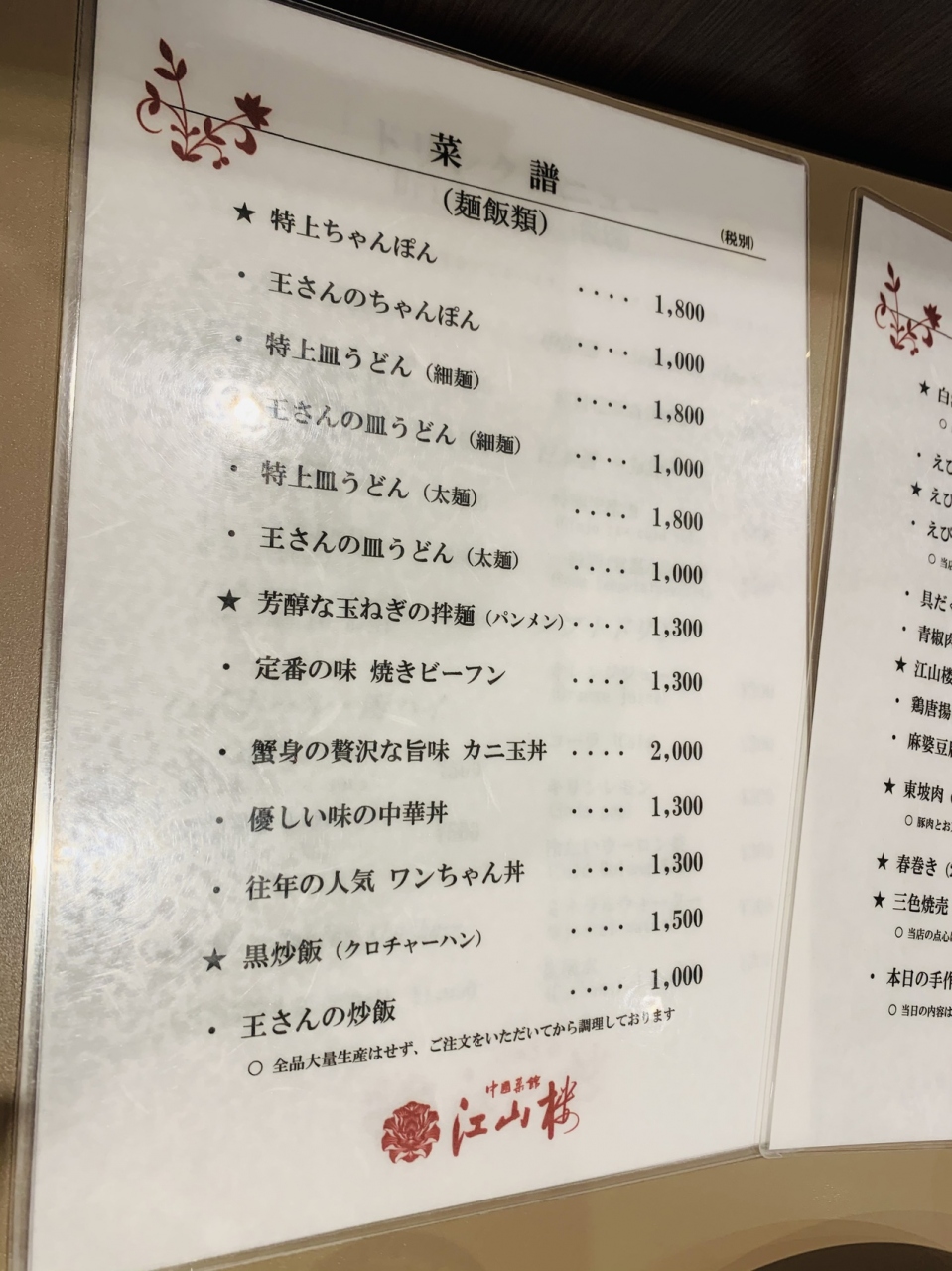 久しぶりに江山楼に行きました。本館は今閉店しており、新館のみ営業しています。土曜日の夕方に行きましたが店内は混雑気味。新型コロナ感染対策として入店時に手を消毒とお茶とお水のセルフサービスのみ。隣の席との間隔は人が1人通れるぐらいの間隔。その上パーテーションなどなし。この店にはソーシャルディスタンスなどなく、帰る頃には満員でレジ前にかなりの人数方々が待っていました。感染対策は不十分だと感じました。