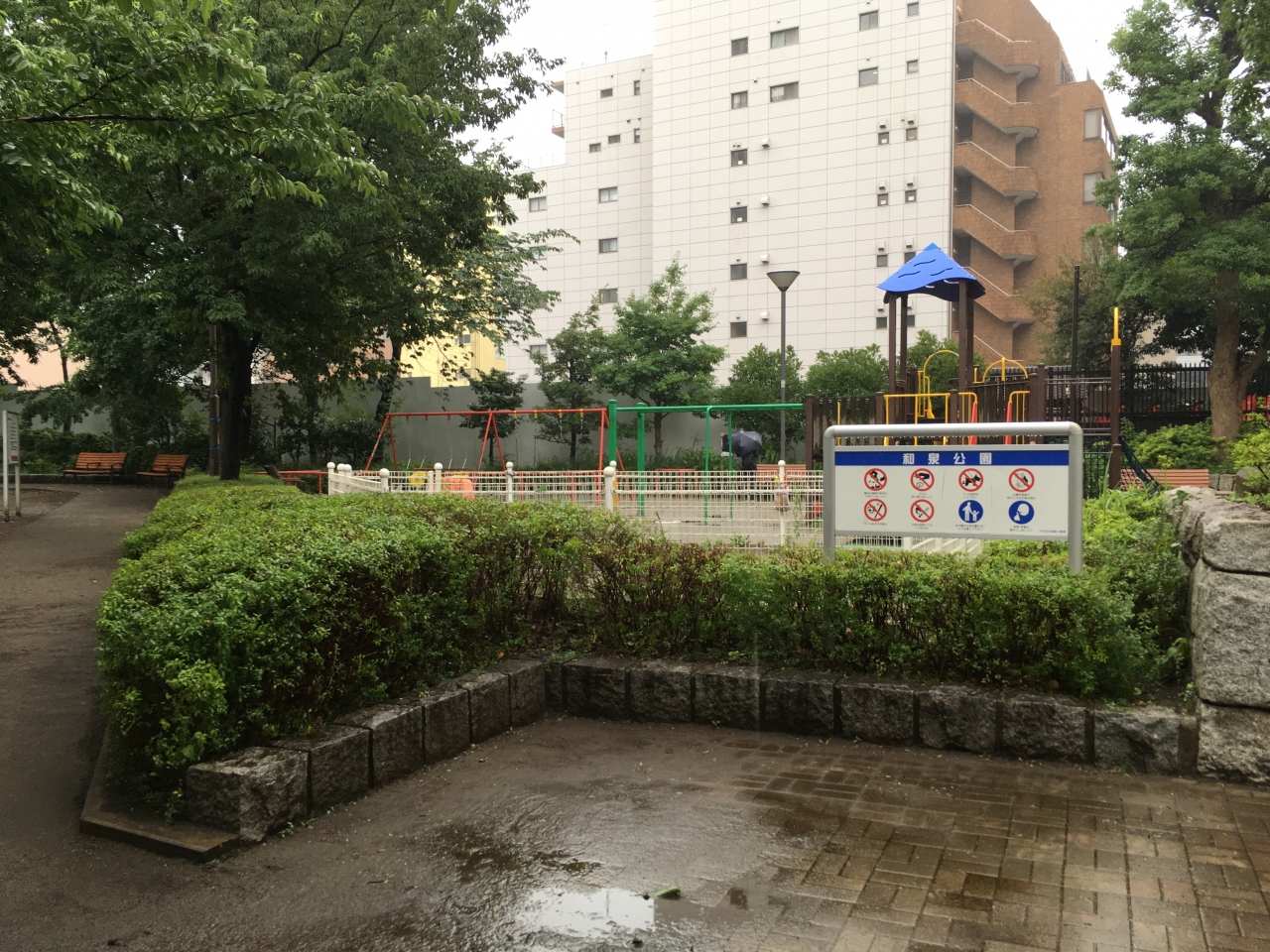 和泉公園は、JR秋葉原駅から徒歩5分くらいのところ、和泉小学校の脇にある公園です。この公園には、子供向けの遊具、芝生広場等がありました。子供が遊ぶのに適したスポットです。隣接して朱の鳥居が並んだ金網稲荷神社がありました。