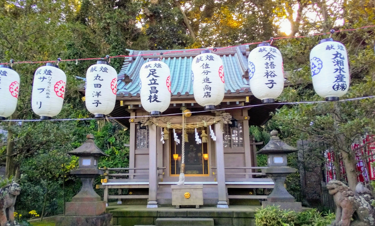案内板によると、建速須佐之男命(タケハヤスサノオノミコト)が祀られ、毎年7月に行われる「江の島天王祭」は 勇壮な夏祭りとして有名だそうですが、訪れた12月は 参拝者も少なく目立たない感じでした。