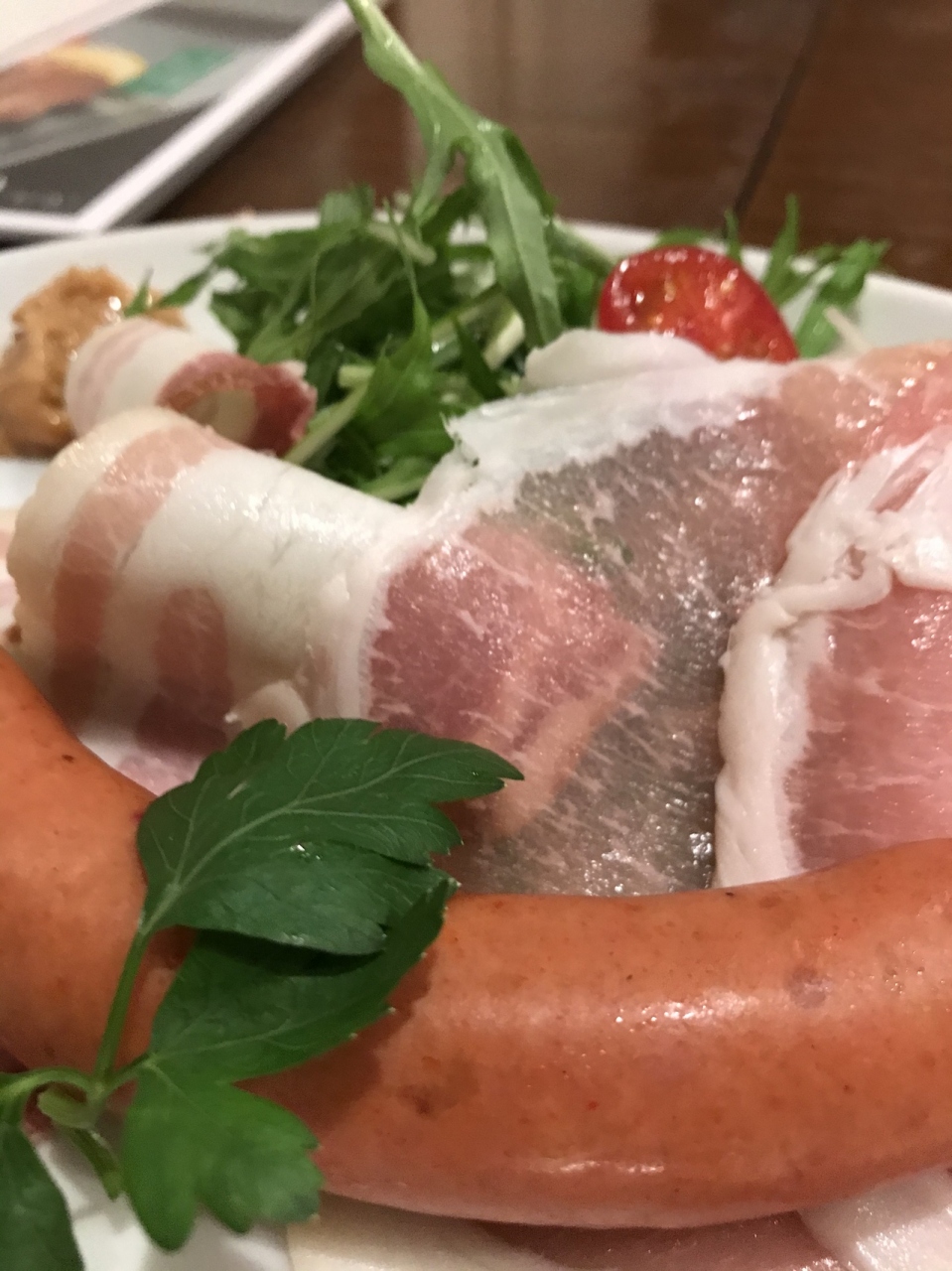 お料理もどれも魅力的でしたが、今回はシンドラーさんの3種もり、ベーコン、生ハム、ソーセージをいただきました。