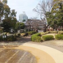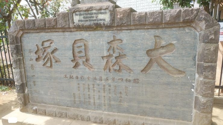 起伏のある公園で家族連れが多く遊んでいる様子が見られた。線路沿いの奥の方に進むと、大森貝塚の碑が設置されている。