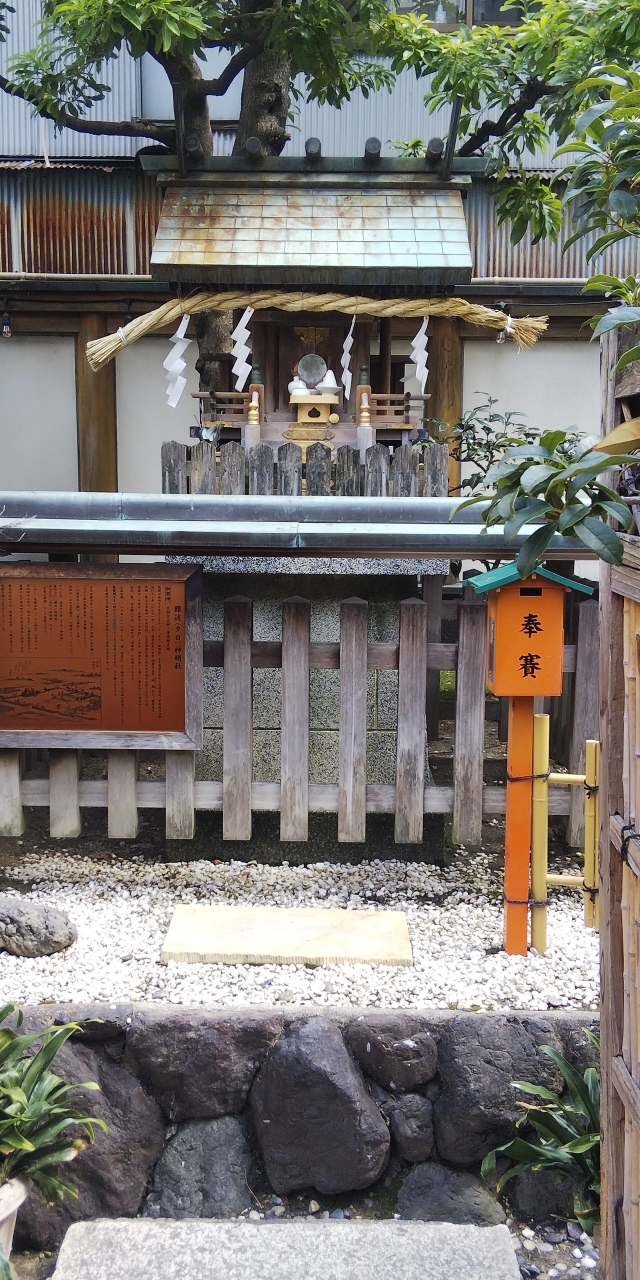 難波神明社は梅田に近い露天神社(お初天神)の境内にある末社です。本殿にむかって右手側の奥にひっそりとあります。末社だけにあまり大きな社ではありません。「夕日の神明」とも呼ばれ、平安初期の頃からの歴史があります。