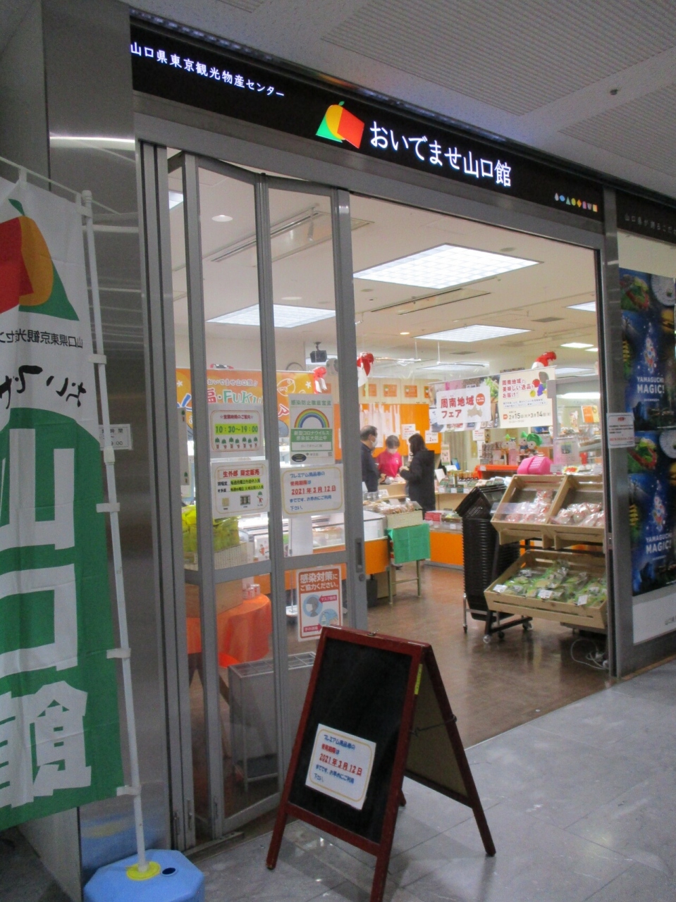 山口県と言ったら、錦帯橋と秋芳洞と日本酒の獺祭くらいしか知らないので、日本橋高島屋から東京駅まで歩いて帰る途中に立ち寄りました。人気商品はちりめん、ういろう、どら焼きなど色々だそうです。角島大橋など他の観光情報も収集できました。