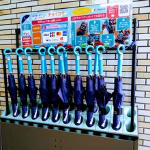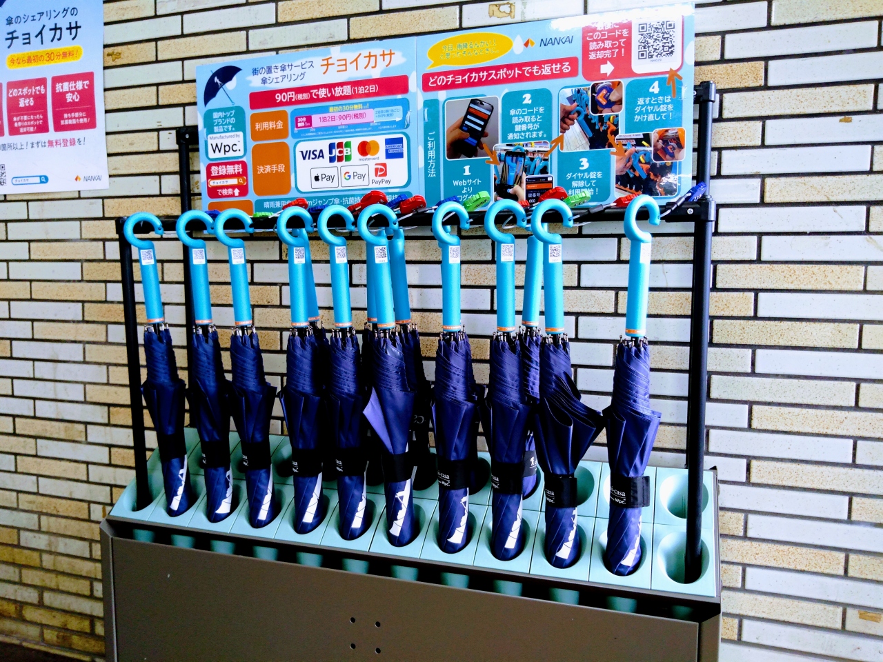 南海電鉄が運営する傘のシェアリングサービスのchoi-casa(チョイカサ)がなんば駅周辺で利用できます。無人運営なのでスマホがないと利用できませんが、30分無料で、1泊2日90円のサービスです。別の場所で返却も可能です。