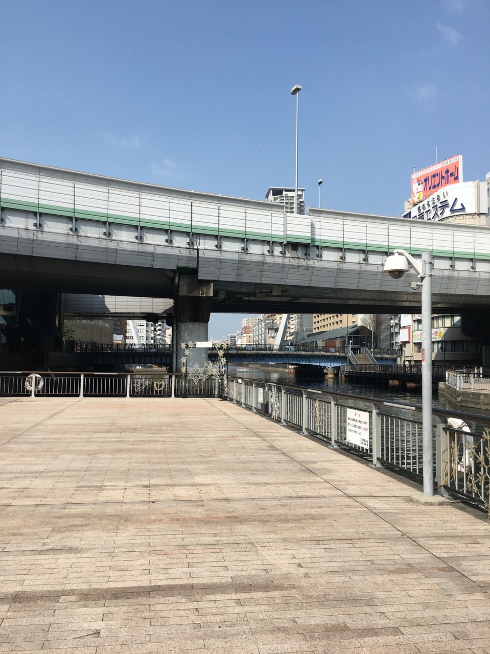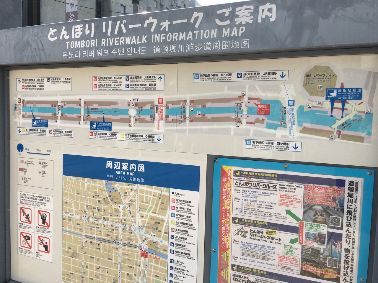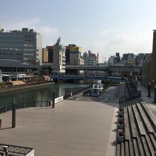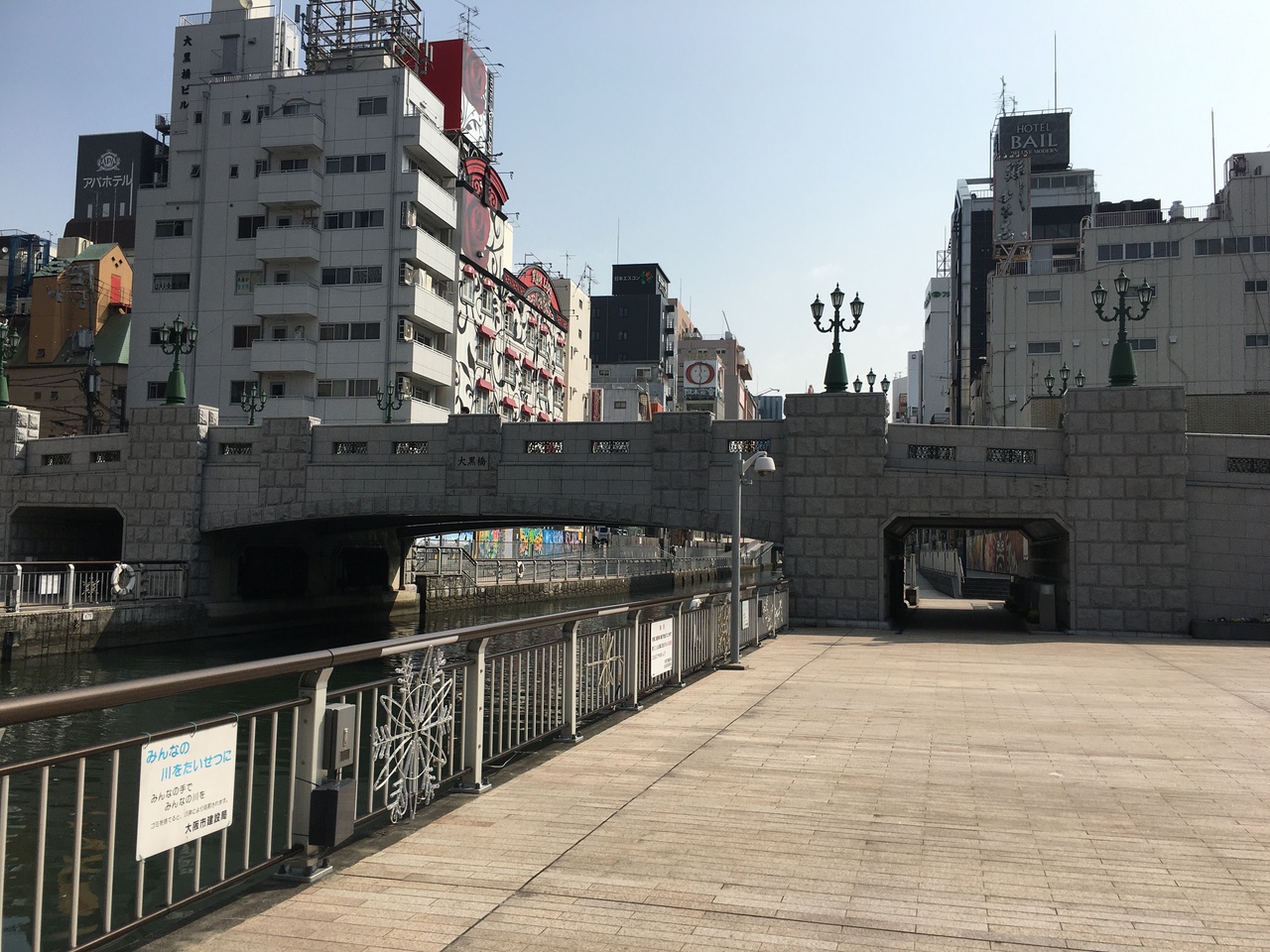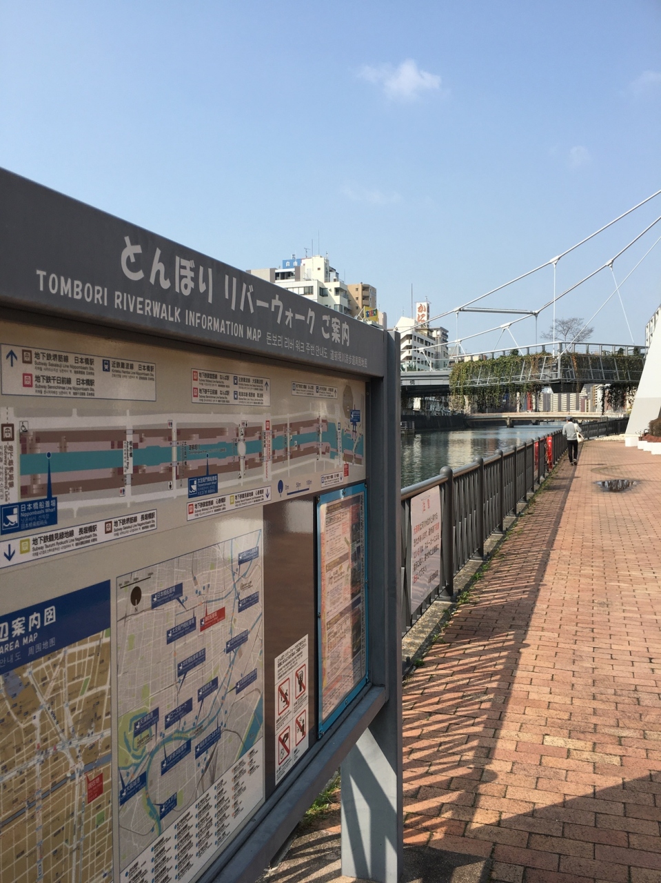 道頓堀川沿いに沿った遊歩道です。両岸にあり川幅が短いため対岸の遊歩道も見えます。川の水面に近い場所を歩くことになり、上にはビルが立ち並んでいて、場所によってはレストラン等お洒落なエリアもありました。川の水は濁っていました。