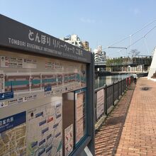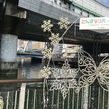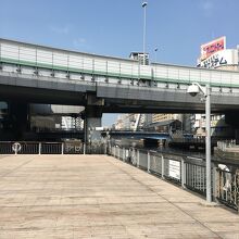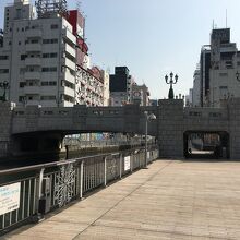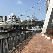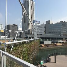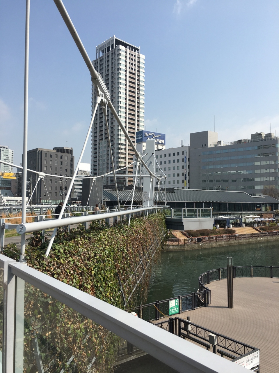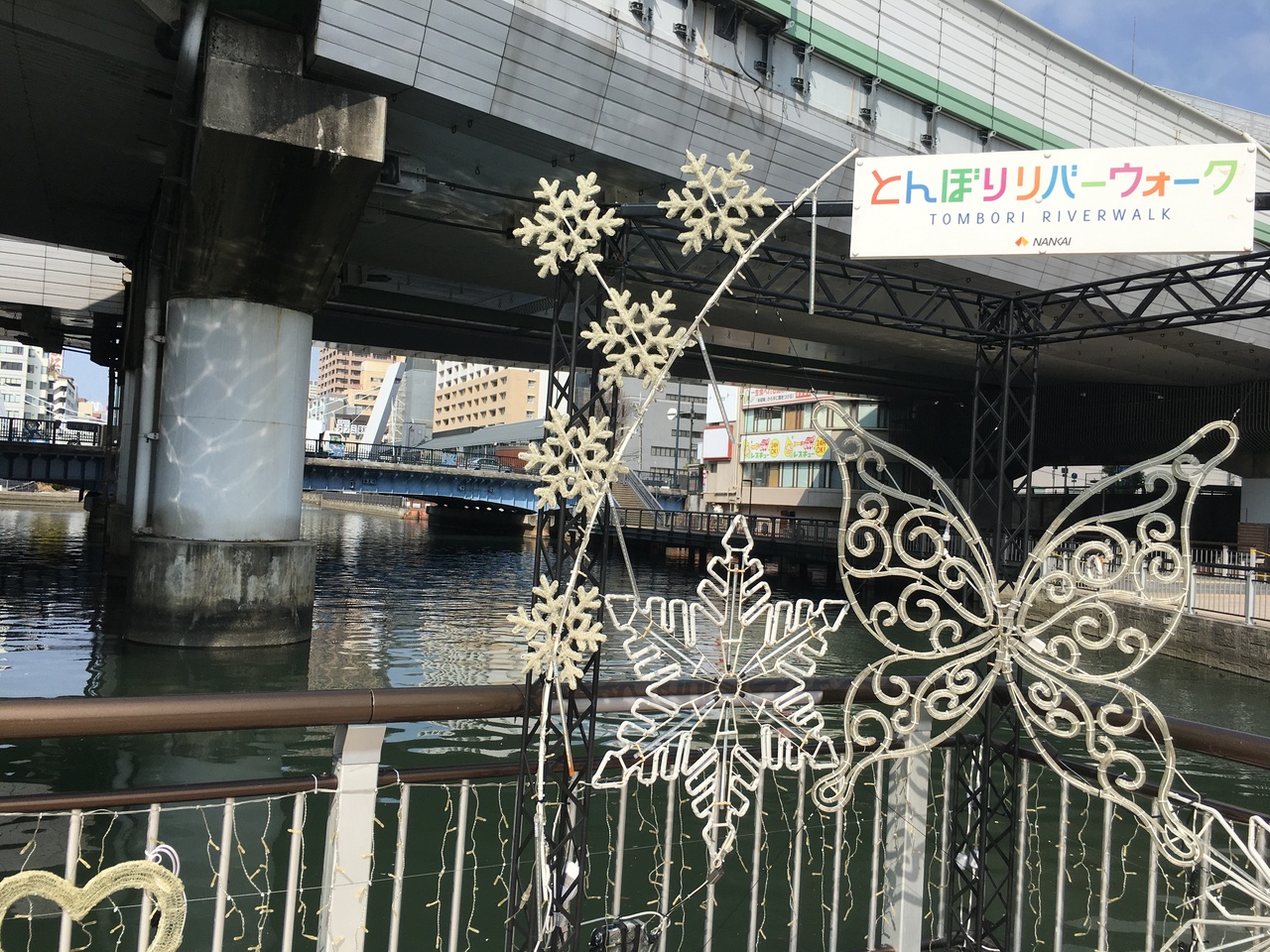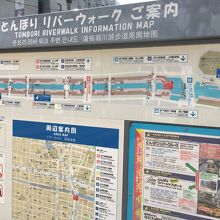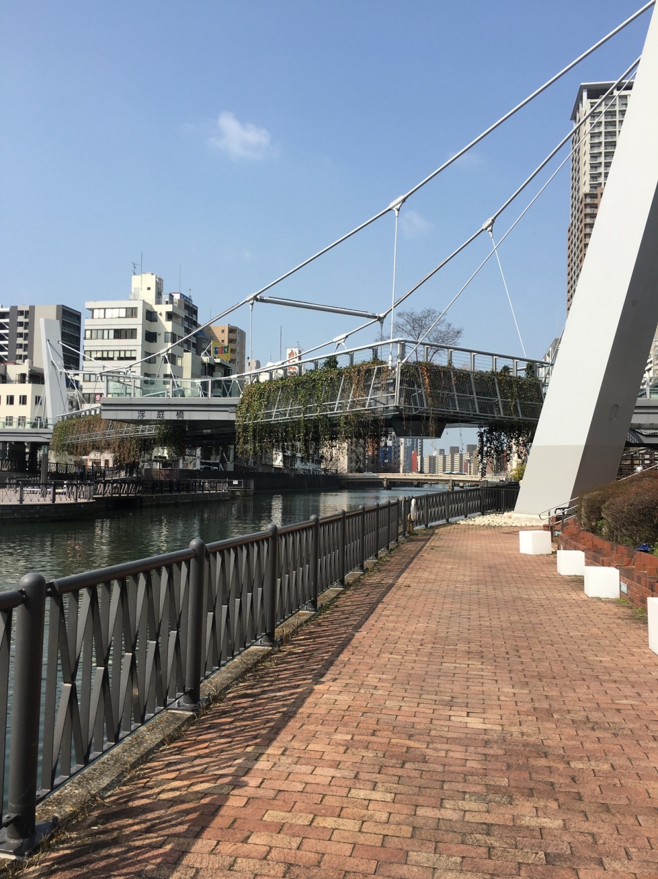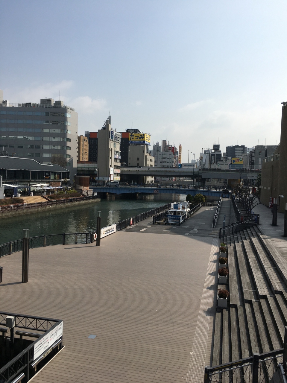 道頓堀川沿いに沿った遊歩道です。両岸にあり川幅が短いため対岸の遊歩道も見えます。川の水面に近い場所を歩くことになり、上にはビルが立ち並んでいて、場所によってはレストラン等お洒落なエリアもありました。川の水は濁っていました。