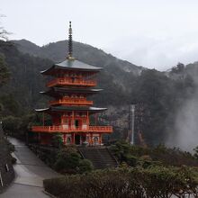 三重塔と滝との景観は、生憎の雨でしたがかえって幻想的な雰囲気で良かったです。