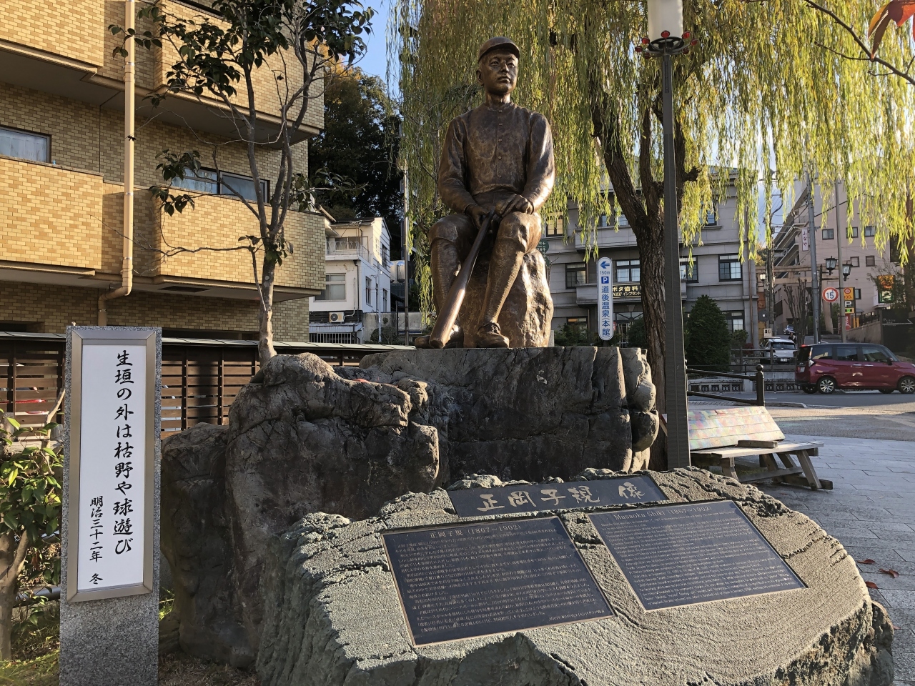 道後温泉駅の前に放生園という広場が整備されており、その一角にあります。ユニフォーム姿にバットを持って座っている姿ですが、あとから調べてみて、正岡子規の選手引退前に撮られた写真がもとになっているのではないかと思いました。近くの道後公園には正岡子規の博物館もあり、今も松山で大切にされている人物であることが感じられました。