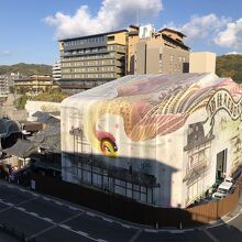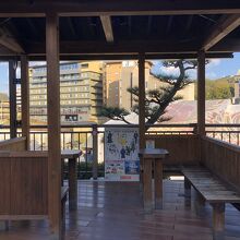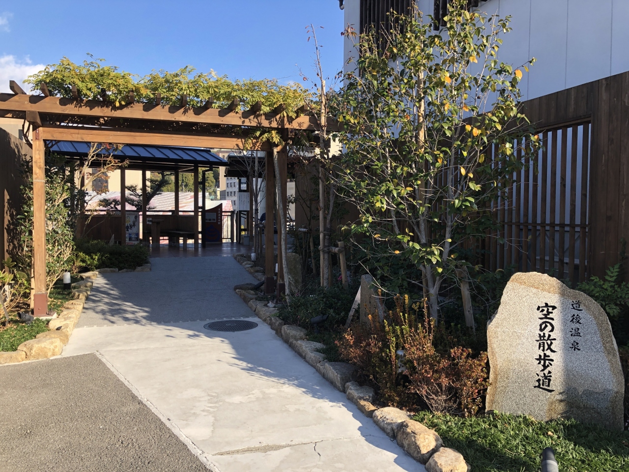 道後温泉本館の横に少し高くなった場所があり、「空の散歩道」として整備されています。2020年12月訪問時、道後温泉本館は改修中でカバーに覆われていましたが、空の散歩道からはカバーのデザインの全体を見渡すことができました。座って景色を時間をかけて楽しんでいる方もいて、休憩にも重宝しそうなスポットだと思いました。