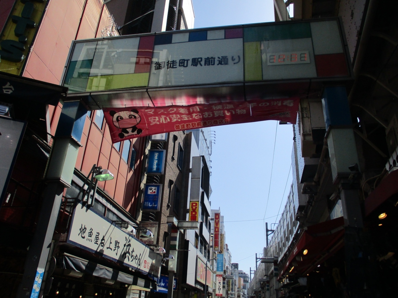 アメ横のあたりに来て、上野駅に行こうとしたらこちらに来ました。自分がどこにいるのかだんだんわからなくなって不安になってきました。この通りはレストランなど多かったです。お店が多いところですね。上野マルイも近くにありました。結局駅にたどり着けました。ほっとしました。