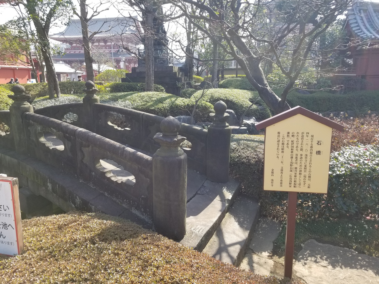 現存する都内最古とされるこの石橋は、1618年浅草寺に今はなき東照宮が造営された際、参詣のための神橋として造られたものであった。
