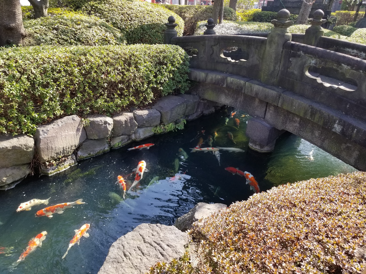 石橋のしたには立派な錦鯉が泳いでいて、水も綺麗だ。