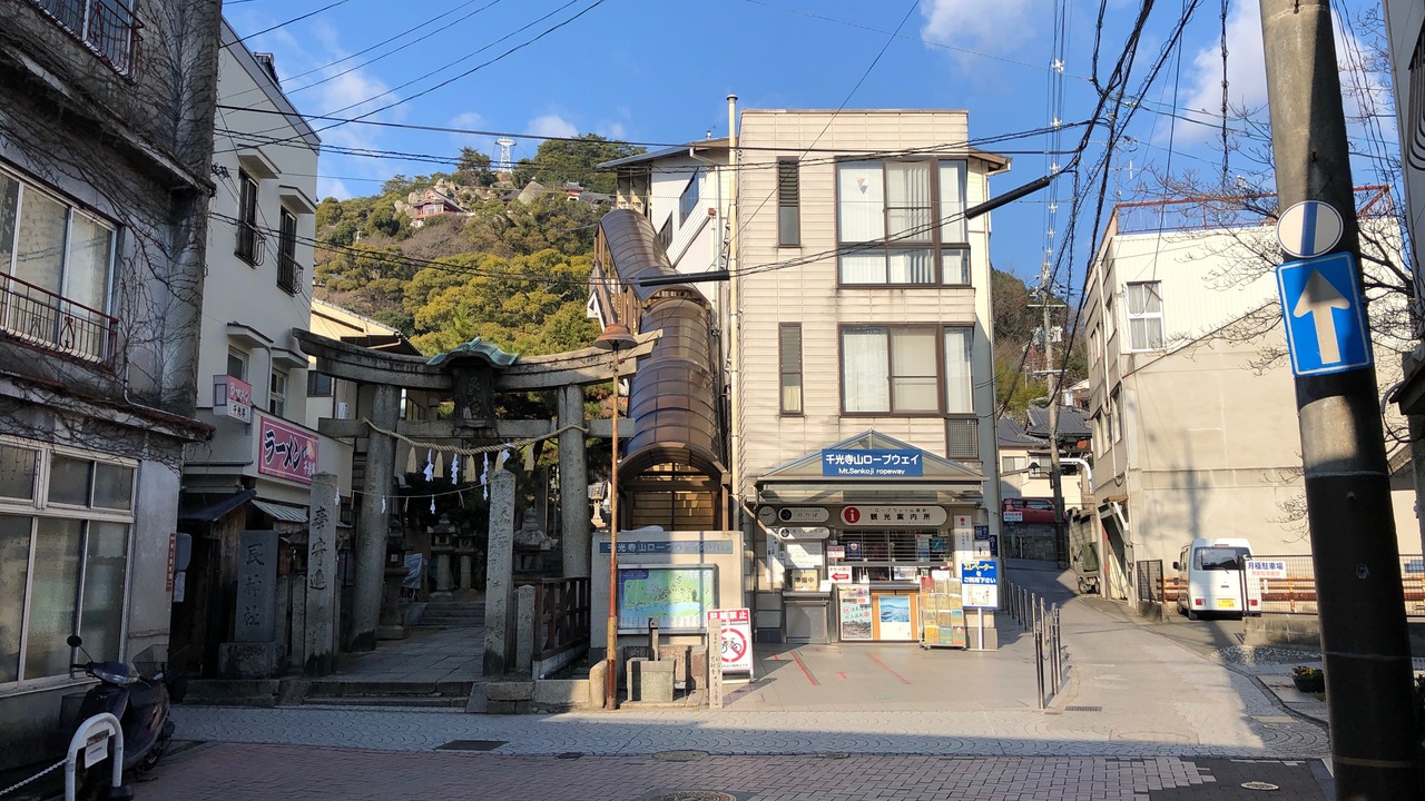 尾道市街地と千光寺山(千光寺公園)を結びます。3分で到着する短いロープウェイです。往復500円と運賃もお手頃です。2021年2月現場、山頂駅から千光寺までの「文学のこみち」などが工事のため通れませんでした。千光寺へ行くには、山麓から歩いた方が良いかもしれません。