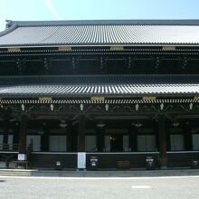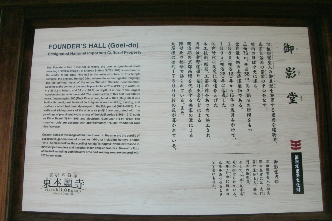 JR京都駅から歩いて10分ほど、烏丸通りに面してある東本願寺の二つの大きな門のうち北側の御影門から入って正面に位置するお堂です。現地にある説明板によると間口76m、奥行き58m、高さ38mで世界最大級の木造建築物だそうです。重要文化財に指定されていますが靴を脱いで実際に上がってお参りすることができます。堂内に入ると凛とした空気感に圧倒されました。