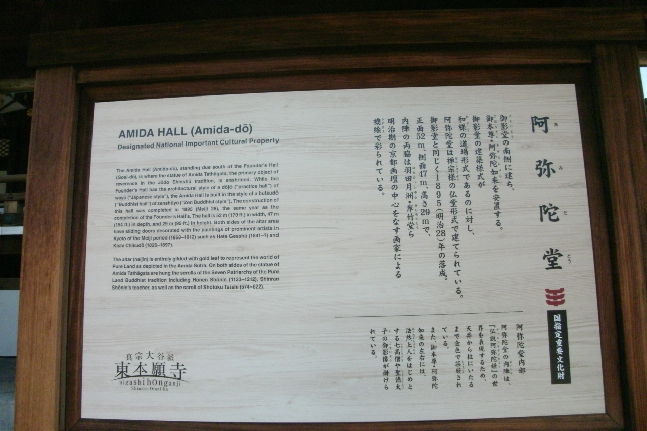 JR京都駅から歩いて10分ほど、烏丸通りに面してある東本願寺の二つの大きな門のうち南側の門である阿弥陀堂門から入って正面に位置するお堂です。間口52m、奥行き47m、高さ29mの大きなお堂で、重要文化財に指定されていますが靴を脱いで外陣に上がってお参りすることができます。堂内に入ってお参りさせていただきましたが凛とした空気感に圧倒されました。