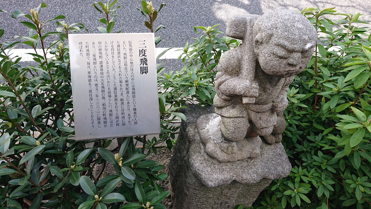 江戸時代の宿場町です。今回訪問して印象に残ったのは、飛脚の石像。なぜ、この岡崎宿の跡に設置されているのかというと、岡崎宿では、飛脚屋が開業していたからだということのようです。どの位のスピードで手紙を配達したのかを想像すると、楽しかったです。
