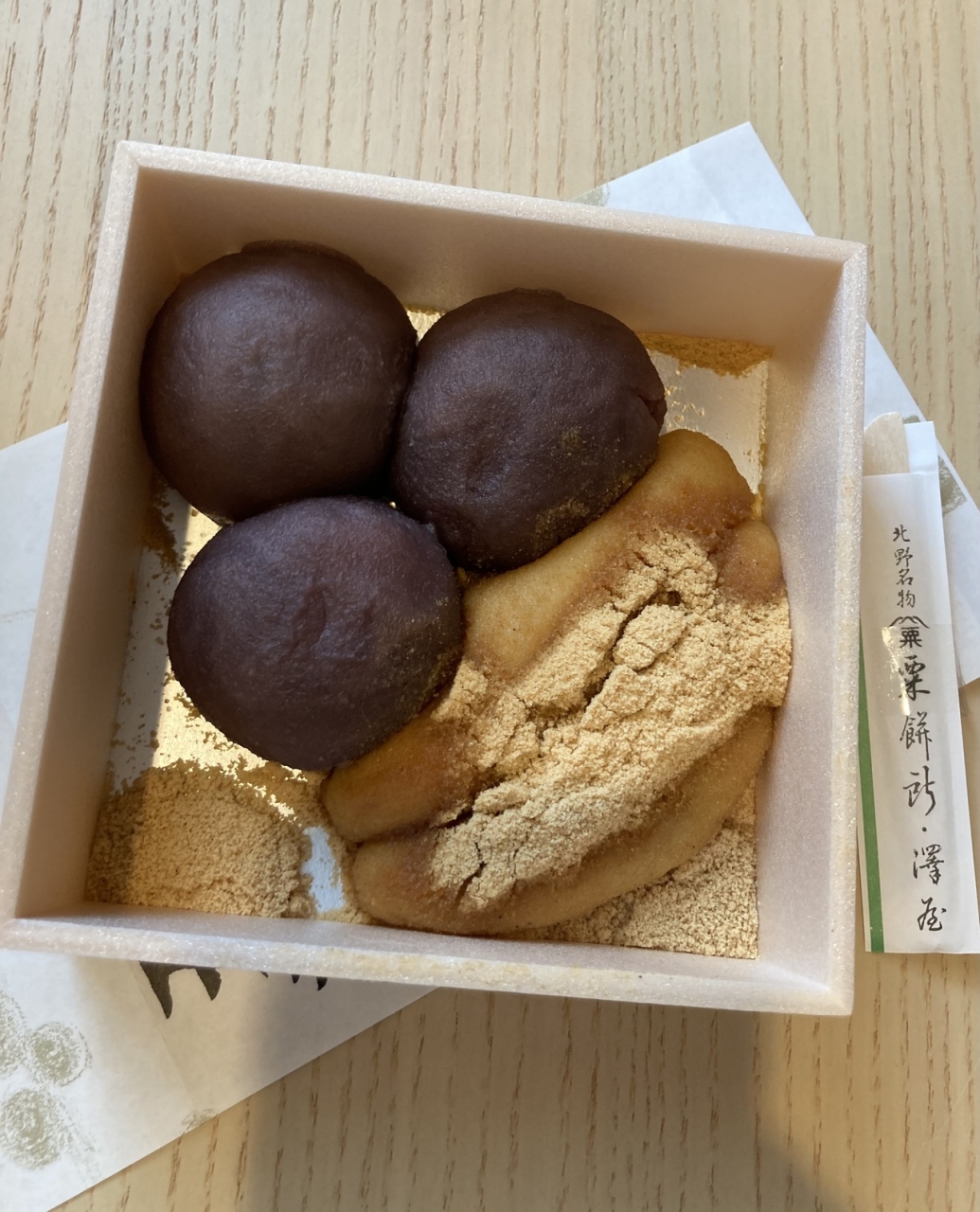 一番小さな箱には、餡子で包んだ粟餅3個、きな粉をまぶした粟餅が2個。持ち帰って食べたせいか、お餅には多少歯応えがあった気がします。きな粉も少ししっとりしていました。それでも充分においしかったのですが、出来たてならもっとおいしいのかもしれません。次の機会にはお店で食べたいと思います。