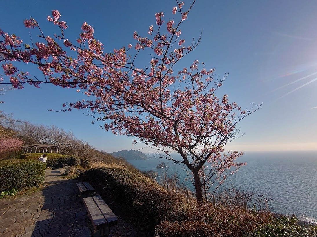国道136号の坂道のてっぺんに近いところにある展望スポットです。駐車スペースがあったので車をとめて海の夕日を眺めました。桜が数本植えられていてちょうど花が咲いてきれいでした。人も少なく静かでいいところです。