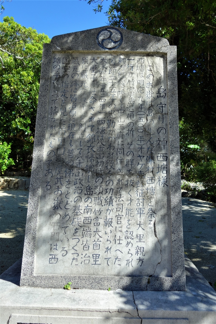 西塘様は実在の人物で、八重山の行政長官を務めたり、島に貢献した偉人です。そのせいか(?)、敷地内に入る事もタブーとされる他の御嶽とは違って、道に面した鳥居からすぐのところにお社が建っています。なので、お社の中も見えるし、実際に入っても大丈夫。