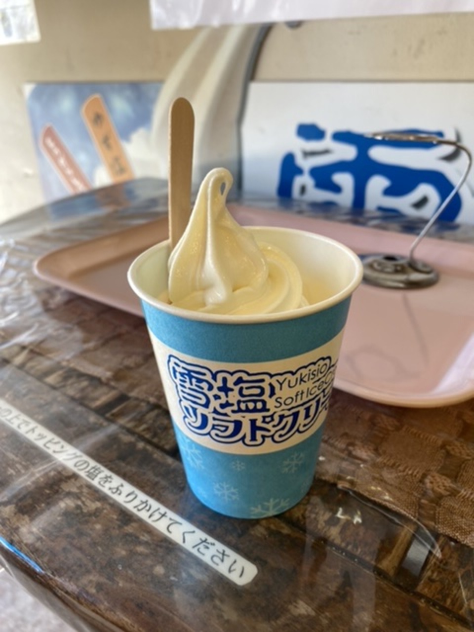 息子と2人で雪塩ソフトクリーム400円を食べました。美味しいですよ(^^)