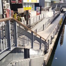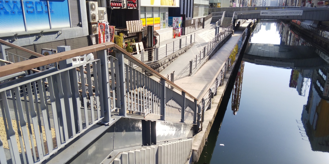 とんぼりウォークは大阪ミナミの道頓堀川ぞいにある川辺の遊歩道です。街中をぶらぶらするところより一段低く、川辺に近いです。普通の建物だとおそらく地下1階ぐらいです。朝8時過ぎに行きましたのでお客さんは少なかったです。