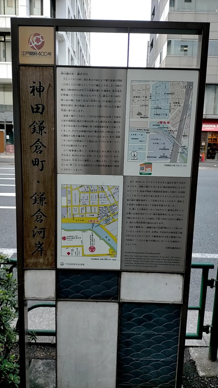 橋の袂には鎌倉河岸と案内板があり、その名前の由来は、江戸城を築くときに鎌倉から石材をここの河岸(内神田寄り)に陸揚げしたので、この河岸を鎌倉河岸と呼んだことによるそうです。