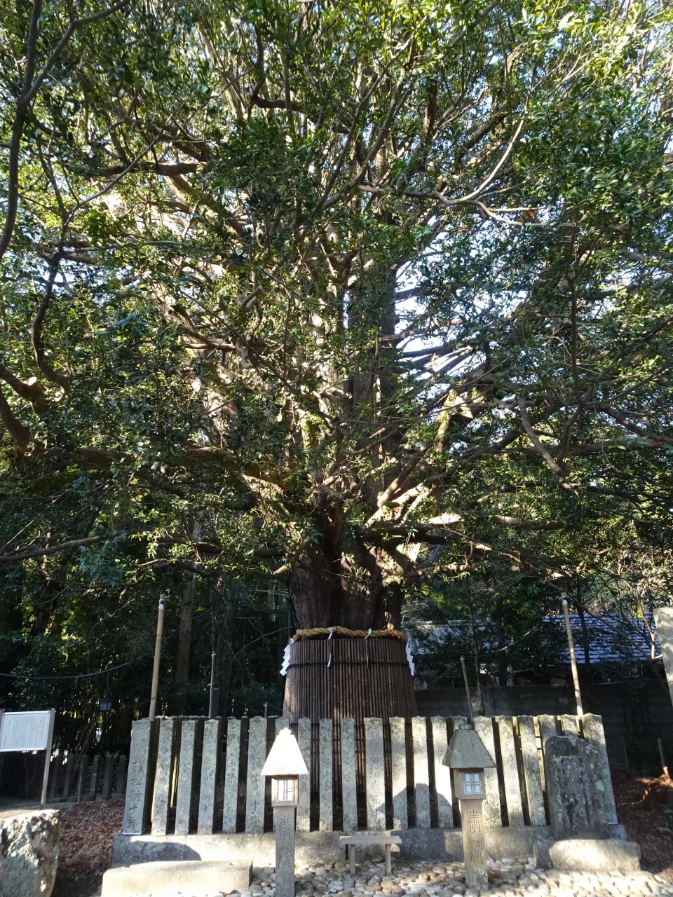 樹齢約千年、梛としては日本一の大樹とのこと。熊野三山では中世の頃から梛の葉が参詣者に渡されお守りとして大切にされたそうです。常緑樹の梛の葉は冬でも青々としっかり繁り、護符として使われたのもうなずけます。