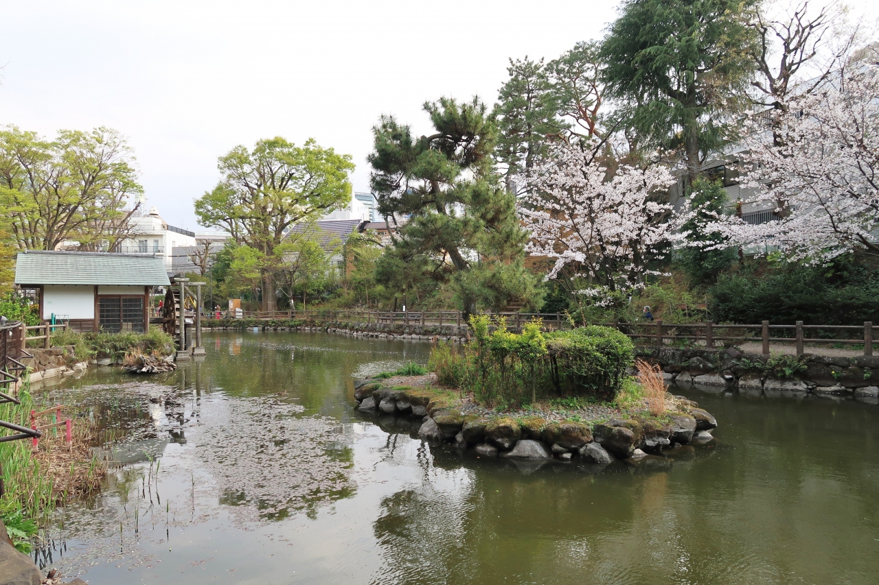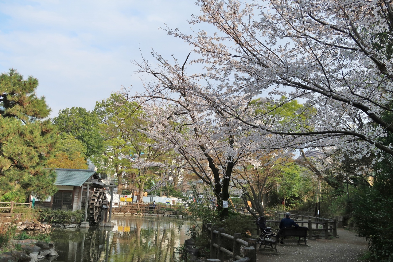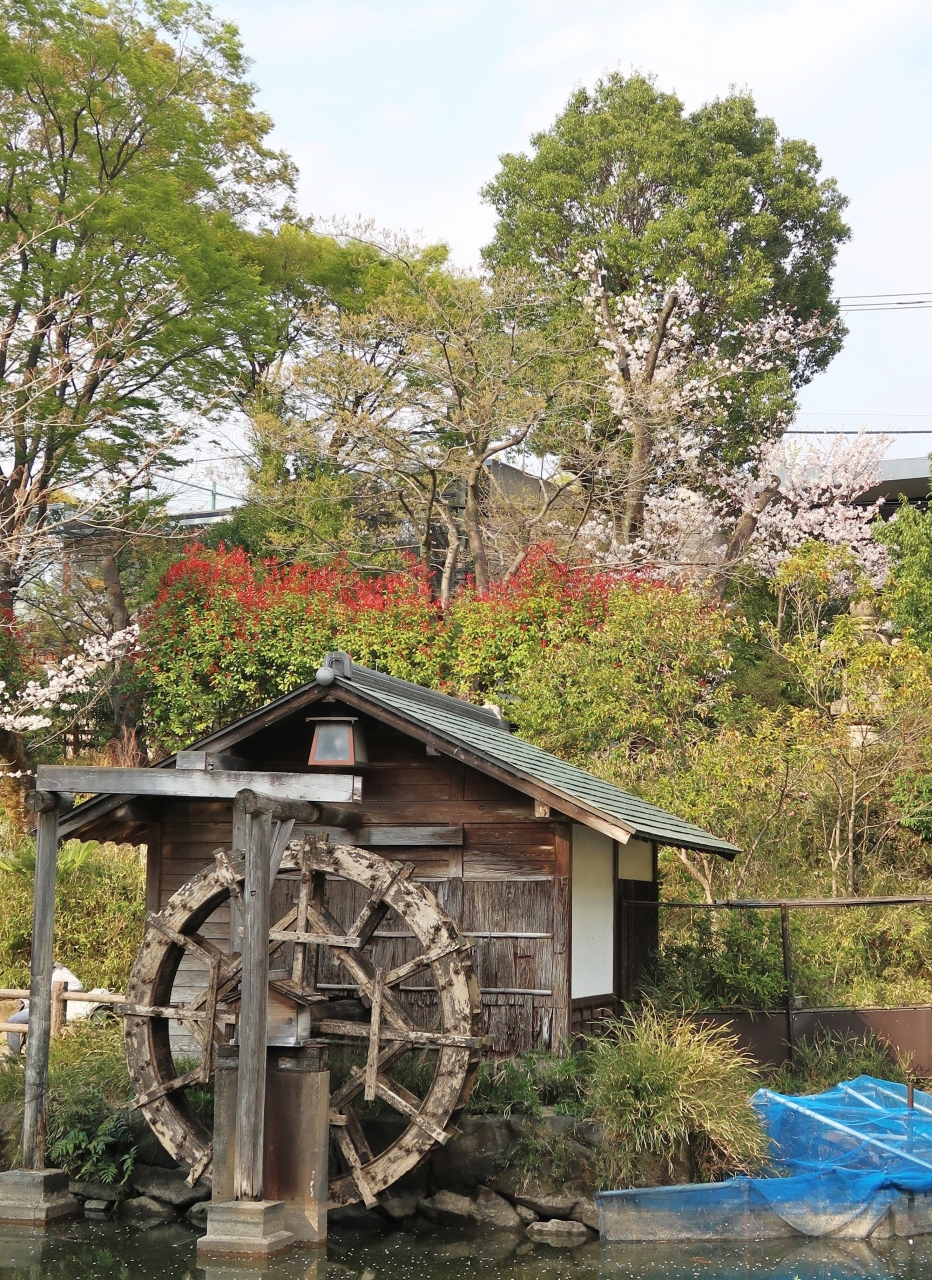 松の梢を揺らす風の音が波の音のように聞こえるという風流な意味合いの地名が付けられた高級住宅街、松濤に、大正時代からある古い公園です。明治時代に紀州徳川家から、佐賀藩主鍋島家に払い下げられ、公園のある一画は鍋島農場だったそうです。公園の3分の2は、水車がある池になっていますが、残念ながら水車は停止していました。池にも特に生物の姿は見かけませんでした。水車小屋が見えるベンチの辺りには桜の木もあり、水車を眺めながらお花見も楽しめます。