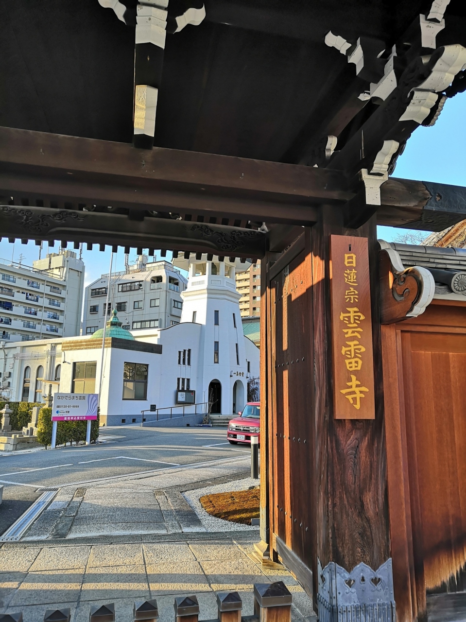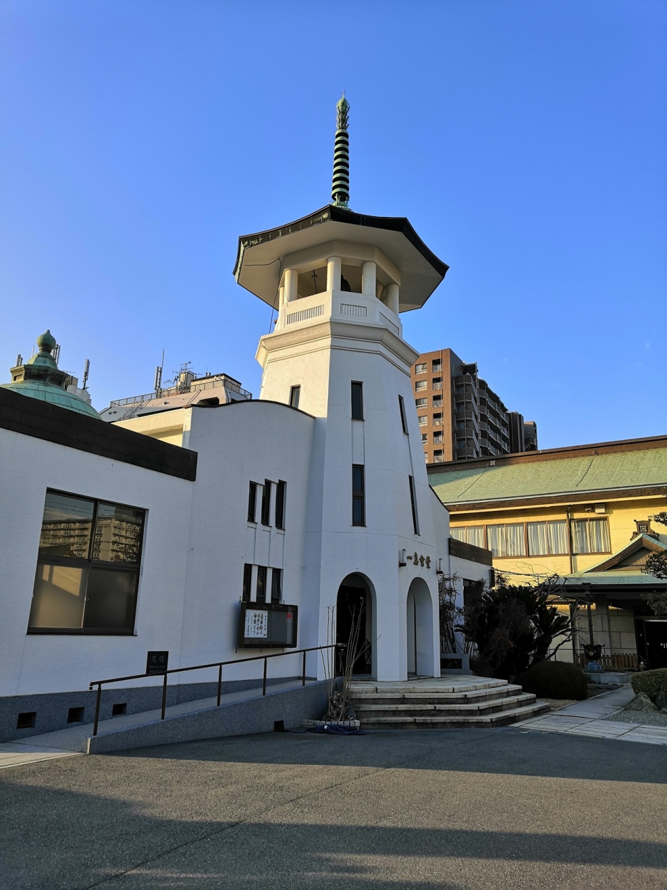 谷町九丁目周辺のお寺の多いエリアにあります。その中でも数が多い日蓮宗のお寺ですが、こちらは本堂からして白い塔のような外観で周辺のお寺と比べても異彩を放っています。本堂の中も見学できますし、似た感じのお寺が多いエリアの中では個性的でした。
