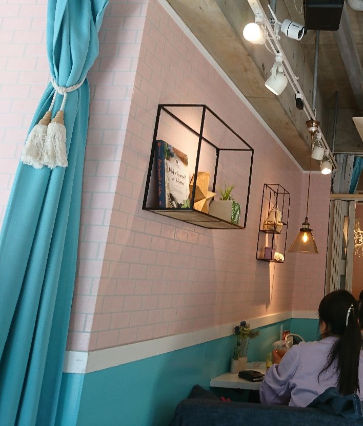 お店はブルーとピンクを基調としていて、外壁にはインスタスポットの羽の絵が描かれていて女子受けしそうな可愛い雰囲気。