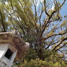 一の鳥居をくぐるとまずは「ふるさとの名木」であり、岡崎市の天然記念物に指定されているクスノキがあります。樹高29mとなかなかの巨木です。あとはひたすら階段を登ると拝殿、本殿にたどり着きます。人けはなく、深い森に包まれているため辺りはひっそり。境内の一画にはかつて三河一向一揆の際に徳川家康が身を隠し難を逃れたという洞窟があります。個人的にはクスノキ推しですが…。