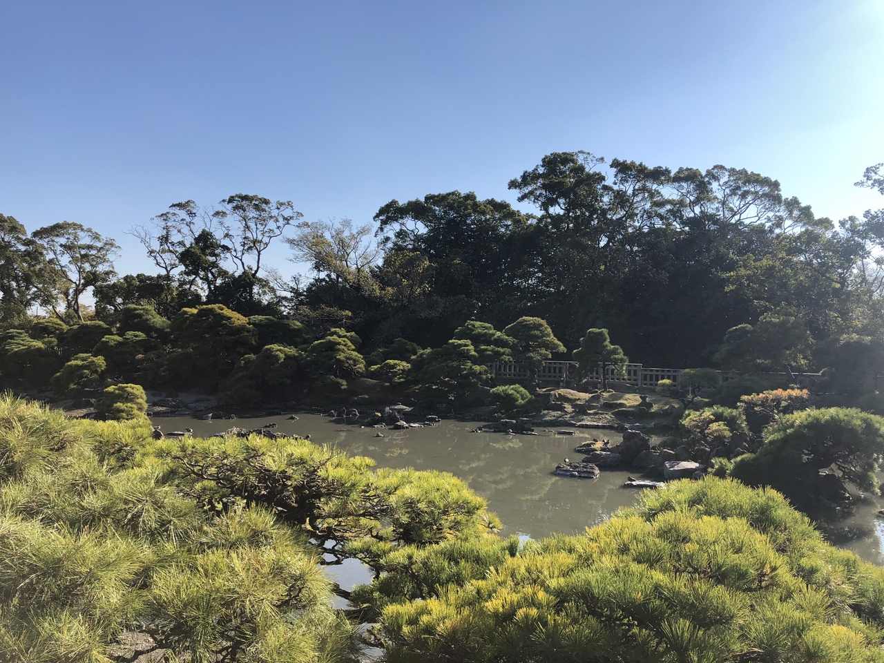 柳川藩主立花邸御花の大広間から見えます。柳川藩主立花邸御花に入るためには入場料が必要です、大広間から見えるお庭は、庭の木々の緑、池、石とのコントラストがよく、とてもよかったです。大広間の造りも質素で、庭と調和していました。