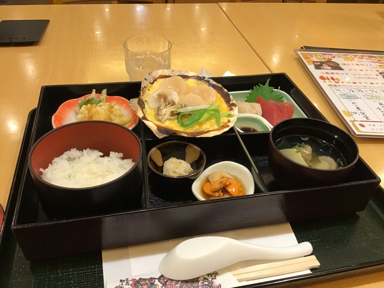 JR青森駅から歩いてすぐの場所にあります。ここでは青森でよく取れる特産物のホタテを使ったホタテづくしの料理を食べることができます。味はとてもおいしかったです。駅からすぐ近くなので空港へ行くバスを待っている待ち時間で利用しました。
