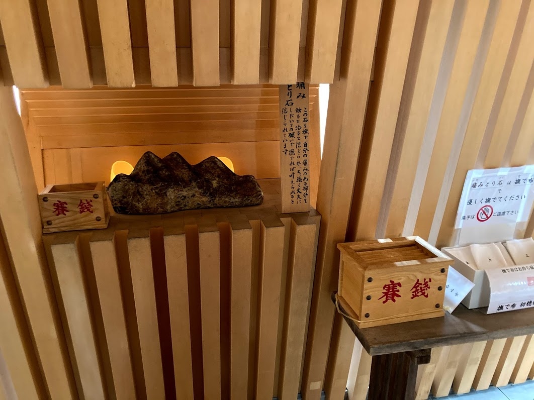 中でも人気なのが、足腰の神様「足王社」です。建物も斬新ですが、やはり「痛みとり石」ですね。500円をおさめた布で石をさすってから自分の痛いところをさすると良くなるそうです。