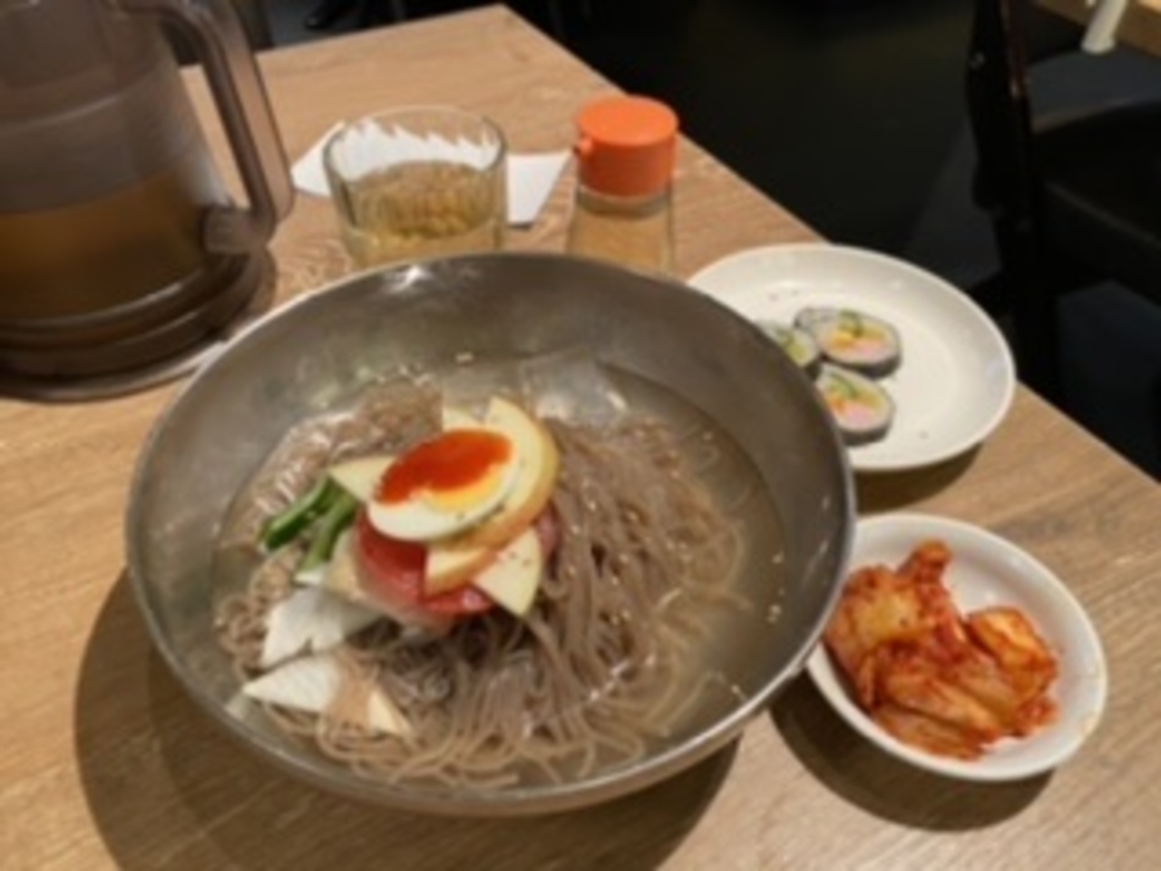 食べたのは韓国冷麺!バンチャンに白菜キムチがあったので白菜キムチのみをおかわりして韓国冷麺に投入!美味いですね(^^)