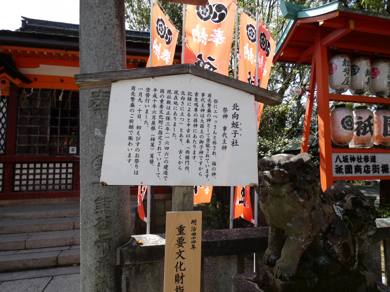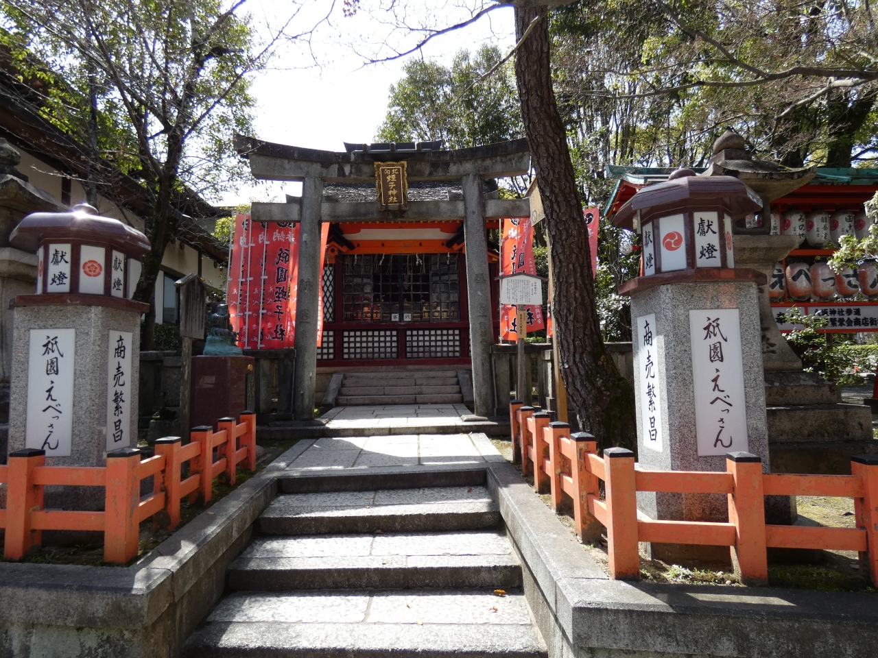 八坂神社西楼門を入った右側に珍しく北を向いて鎮座する末社で国の重要文化財に指定されています。商売繁盛で笹もってこいの掛け声で馴染みのエビス信仰は全国各地に広がっています。鳥居横には祇園えべっさんと書かれた灯籠が迎えてくれます。大阪の今宮戎神社は八坂神社の氏子が今宮に移り住んだ時に祇園のえべっさんをおお祀りしたことが始まりだそうです。